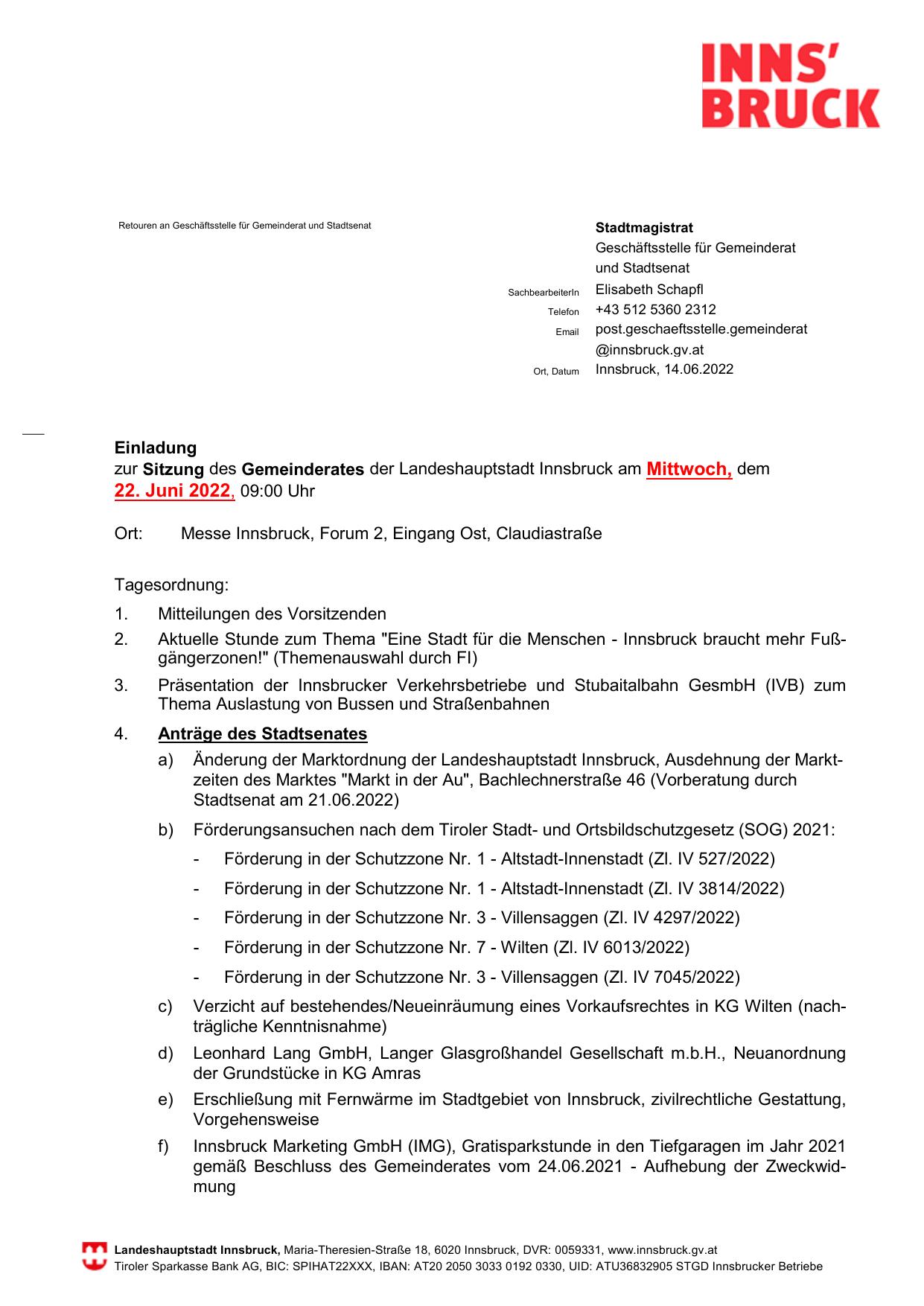 zur Sitzung des Gemeinderates der Landeshauptstadt Innsbruck am Mittwoch, dem