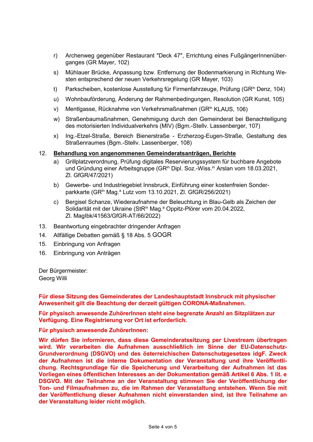 Für diese Sitzung des Gemeinderates der Landeshauptstadt Innsbruck mit physischer