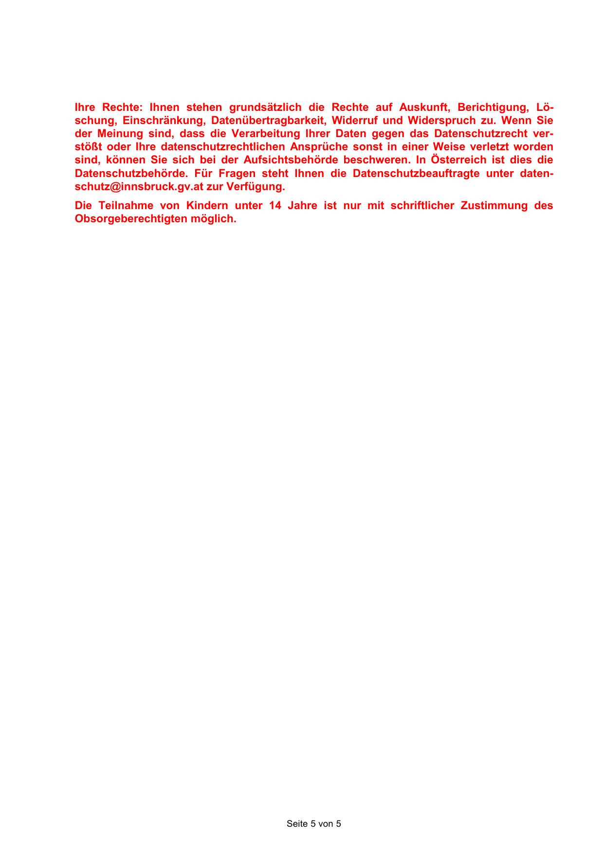 Datenschutzbehörde. Für Fragen steht Ihnen die Datenschutzbeauftragte unter datenschutz@innsbruck.gv.at zur Verfügung.
