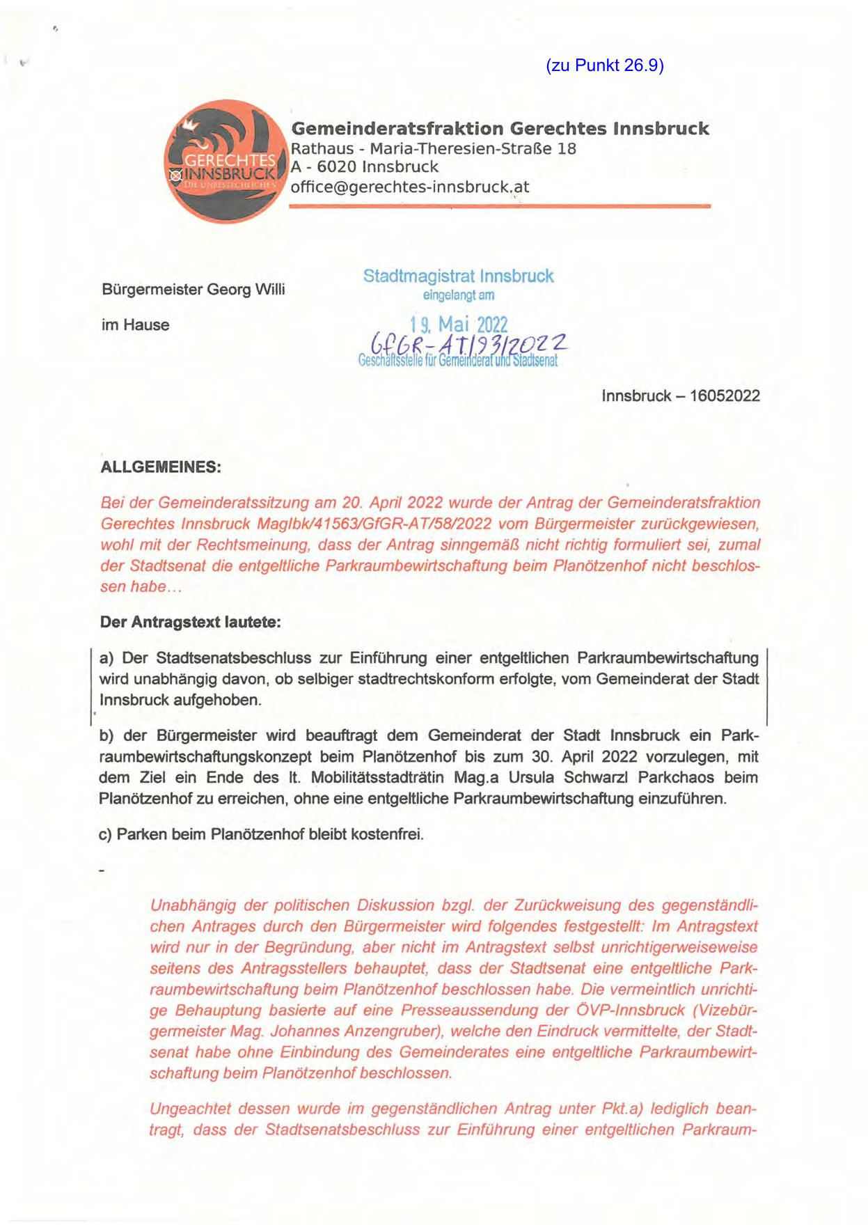 Gerechtes Innsbruck Maglbk/41563/GfGR-A T/58/2022 vom Bürgermeister zurückgewiesen,