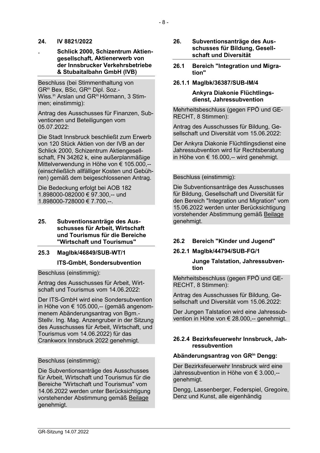 Mehrheitsbeschluss (gegen FPÖ und GERECHT, 8 Stimmen):