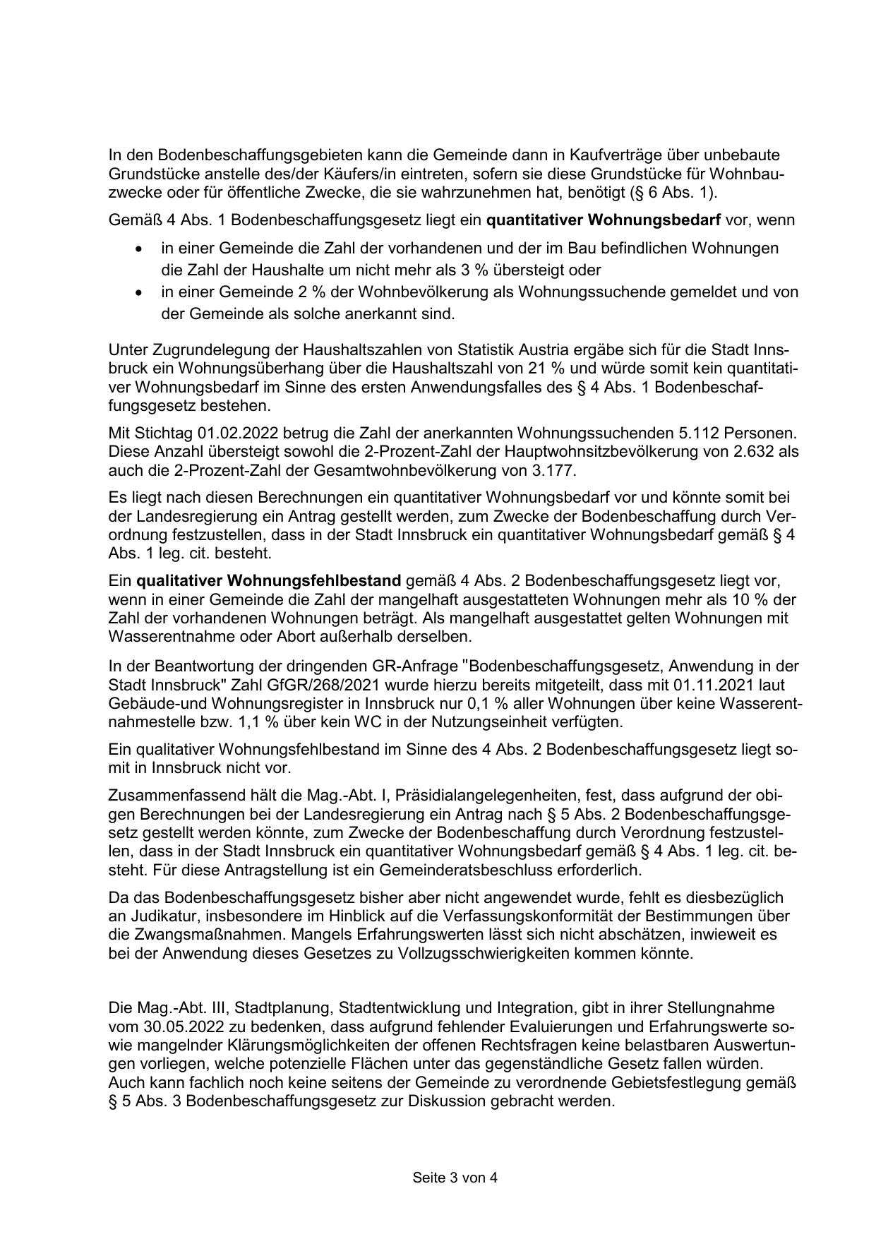 Zusammenfassend hält die Mag.-Abt. I, Präsidialangelegenheiten, fest, dass aufgrund der obigen Berechnungen bei der Landesregierung ein Antrag nach § 5 Abs. 2 Bodenbeschaffungsgesetz gestellt werden könnte, zum Zwecke der Bodenbeschaffung durch Verordnung festzustellen, dass in der Stadt Innsbruck ein quantitativer Wohnungsbedarf gemäß § 4 Abs. 1 leg. cit. besteht. Für diese Antragstellung ist ein Gemeinderatsbeschluss erforderlich.
