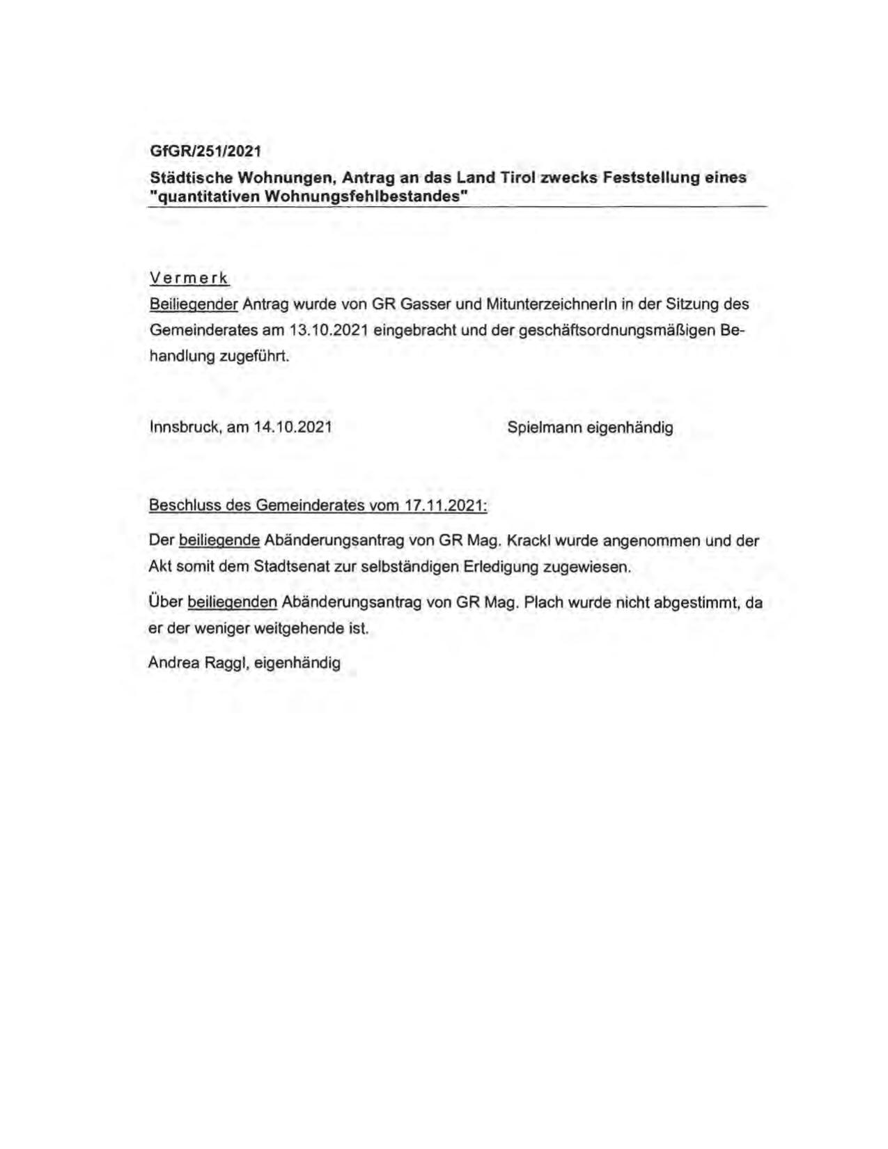 Städtische Wohnungen, Antrag an das Land Tirol zwecks Feststellung eines
