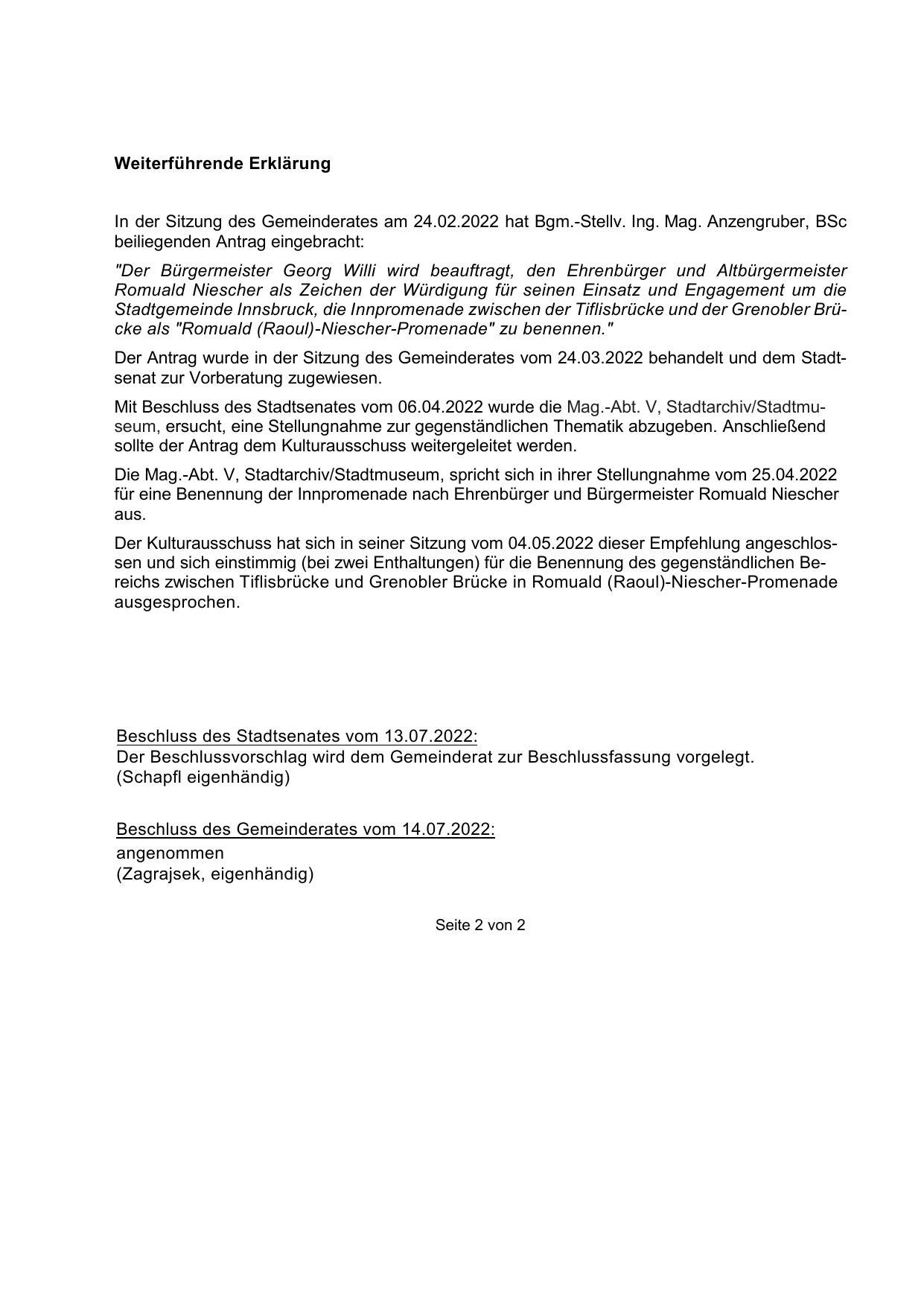 Der Kulturausschuss hat sich in seiner Sitzung vom 04.05.2022 dieser Empfehlung angeschlossen und sich einstimmig (bei zwei Enthaltungen) für die Benennung des gegenständlichen Bereichs zwischen Tiflisbrücke und Grenobler Brücke in Romuald (Raoul)-Niescher-Promenade