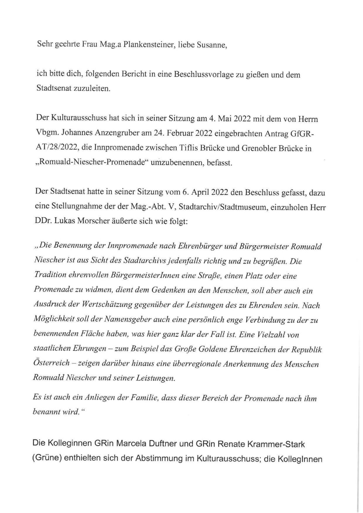 Vbgm. Johannes Anzengruber am 24. Februar 2022 eingebrachten Antrag GfGRAT/28/2022, die Innpromenade zwischen Tiflis Brücke und Grenobler Brücke in