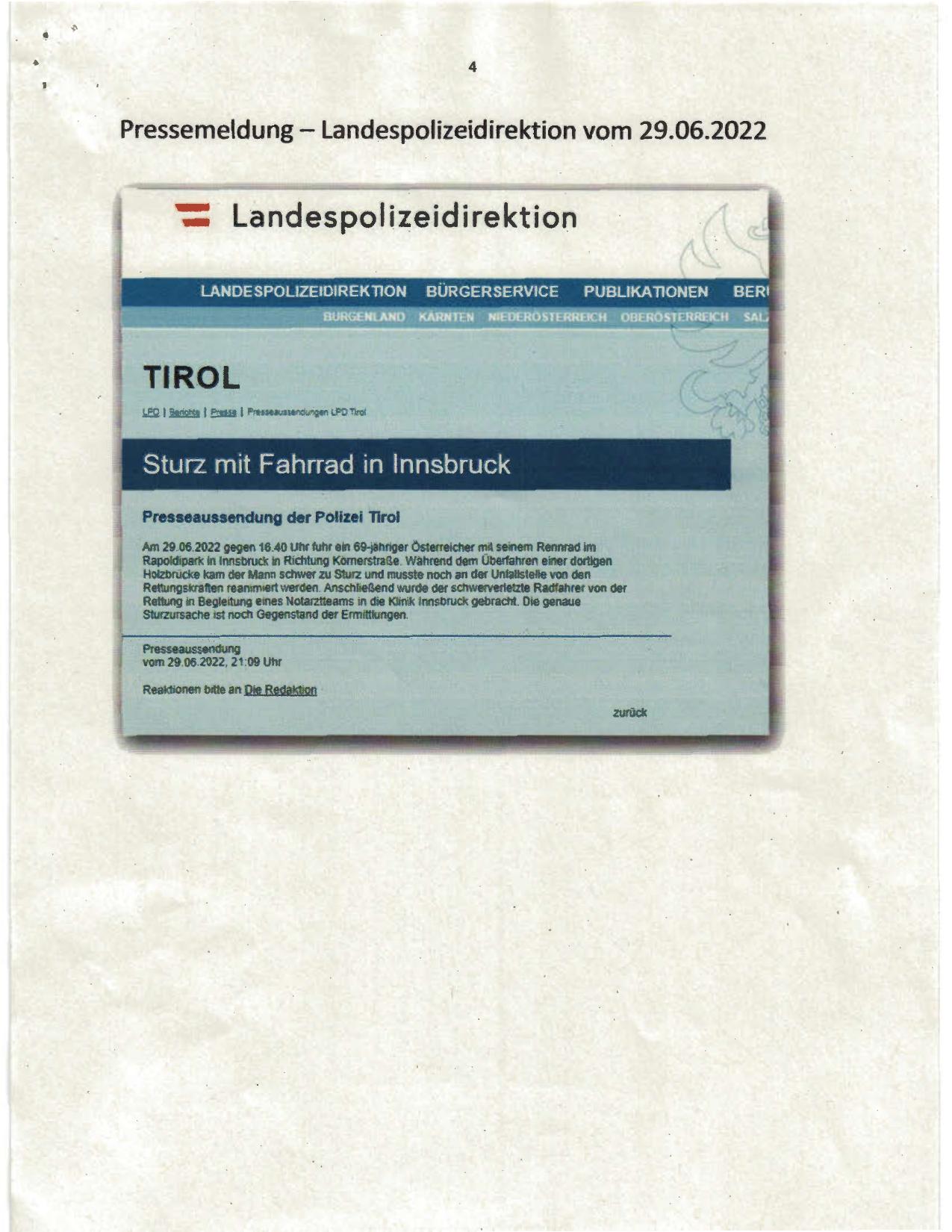 Am 29 06.2022 gegen 16 40 Uhf fuhr ein 69-)ahnger Osterrelcher mit setnem Rennra Rapold1par1c m lnnsbruek in Rtdltuno Komerslraße Wahrend dem überfahren einer dortigen