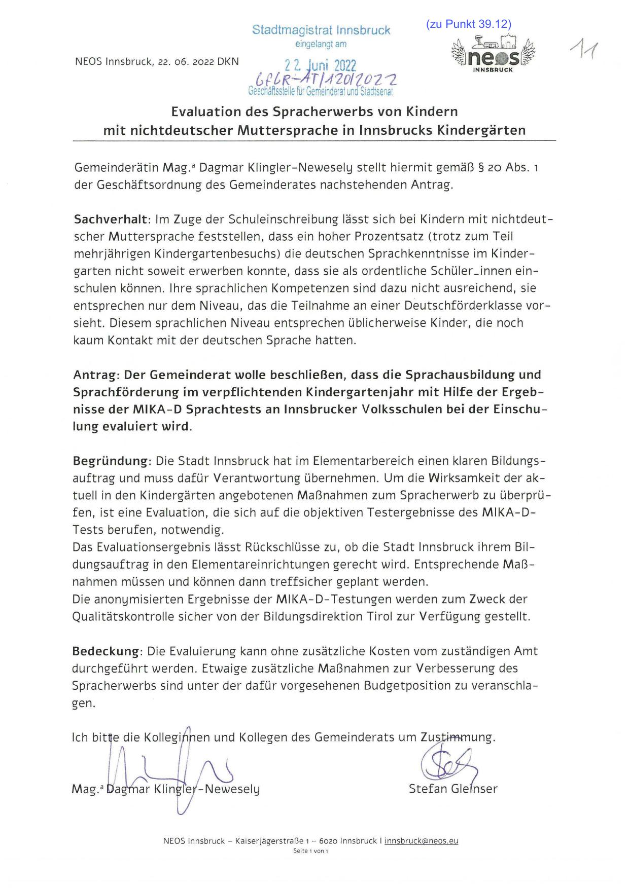 Begründung: Die Stadt Innsbruck hat im Elementarbereich einen klaren Bildungsauftrag und muss dafür Verantwortung übernehmen. Um die Wirksamkeit der aktuell in den Kindergärten angebotenen Maßnahmen zum Spracherwerb zu überprüfen, ist eine Evaluation, die sich auf die objektiven Testergebnisse des MIKA-DTests berufen, notwendig.