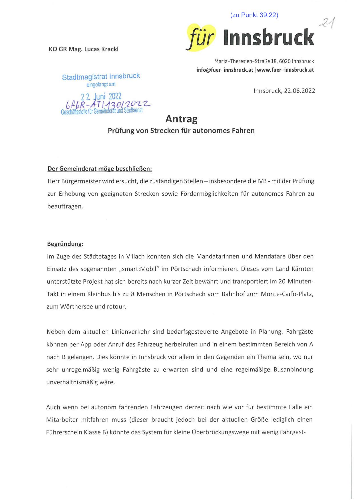 Herr Bürgermeister wird ersucht, die zuständigen Stellen - insbesondere die IVB - mit der Prüfung