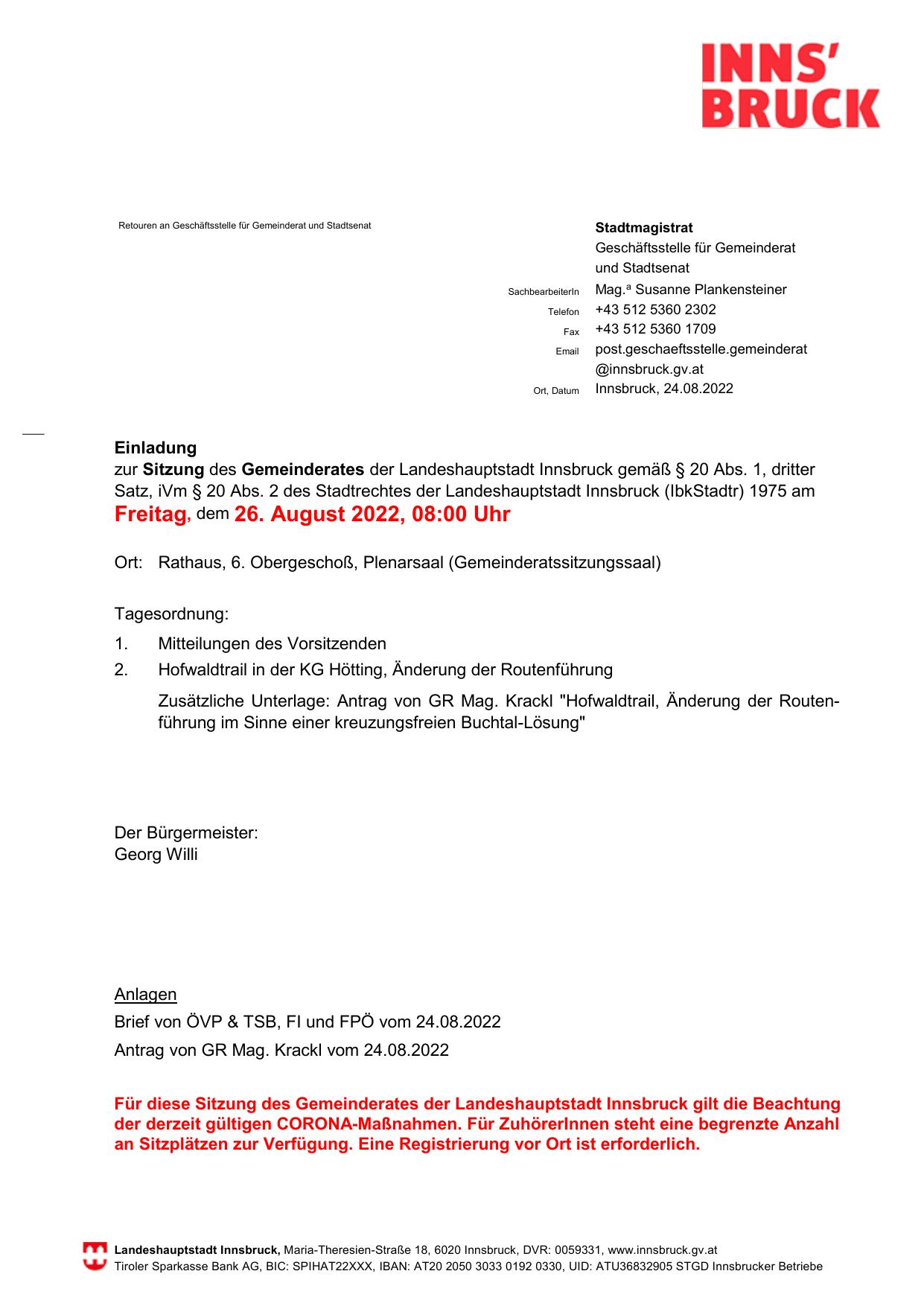 Für diese Sitzung des Gemeinderates der Landeshauptstadt Innsbruck gilt die Beachtung