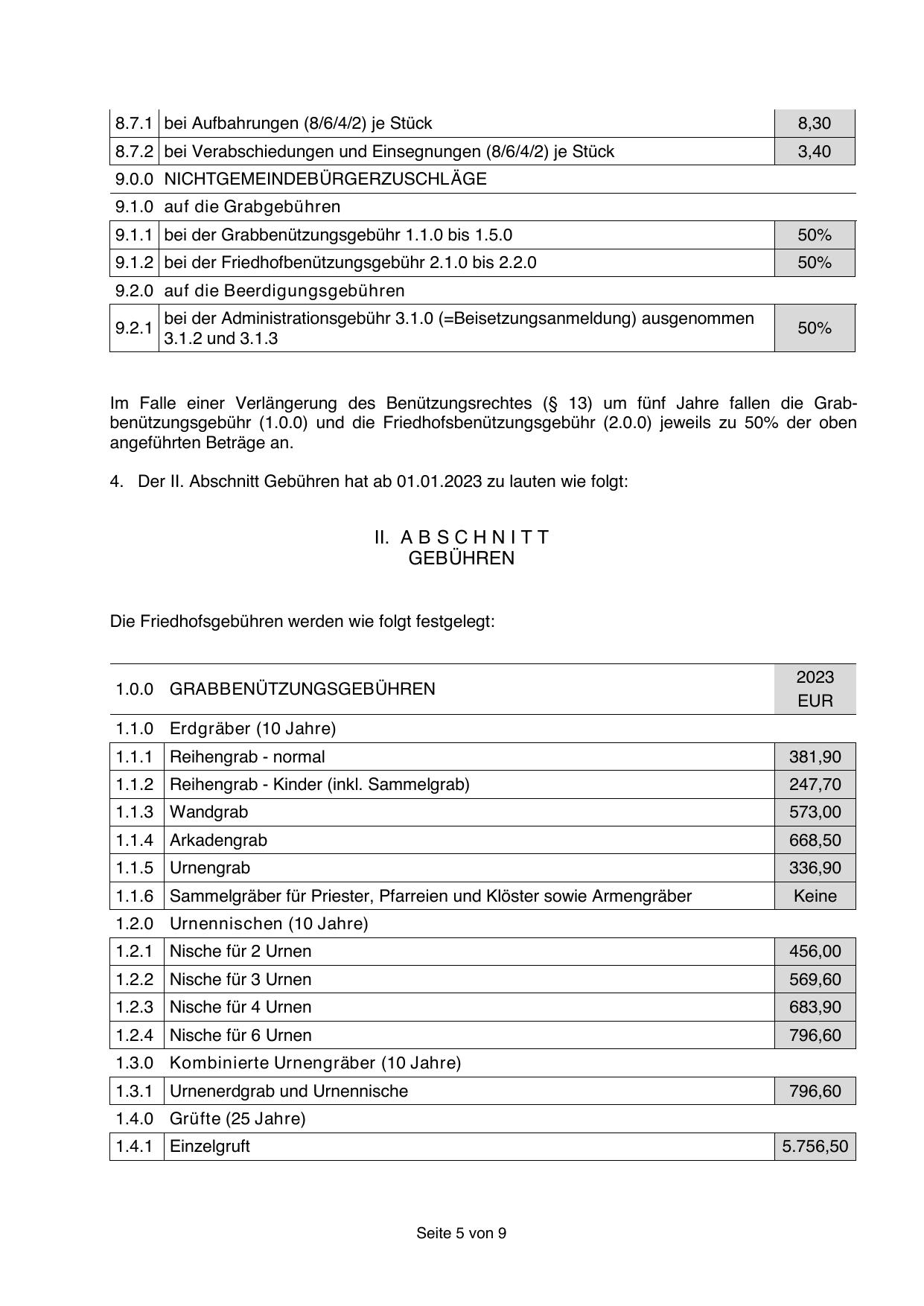 9.1.1 bei der Grabbenützungsgebühr 1.1.0 bis 1.5.0