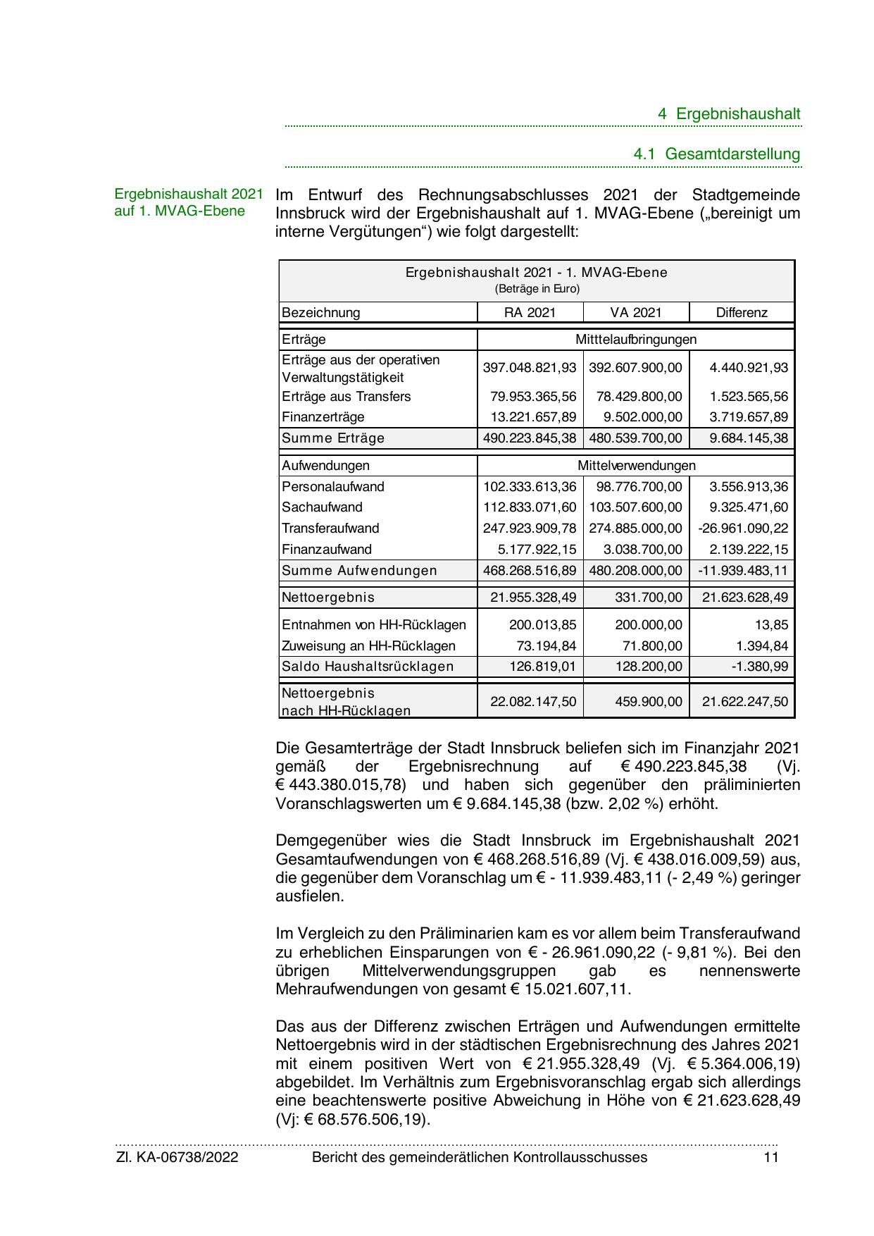 Innsbruck wird der Ergebnishaushalt auf 1. MVAG-Ebene („bereinigt um