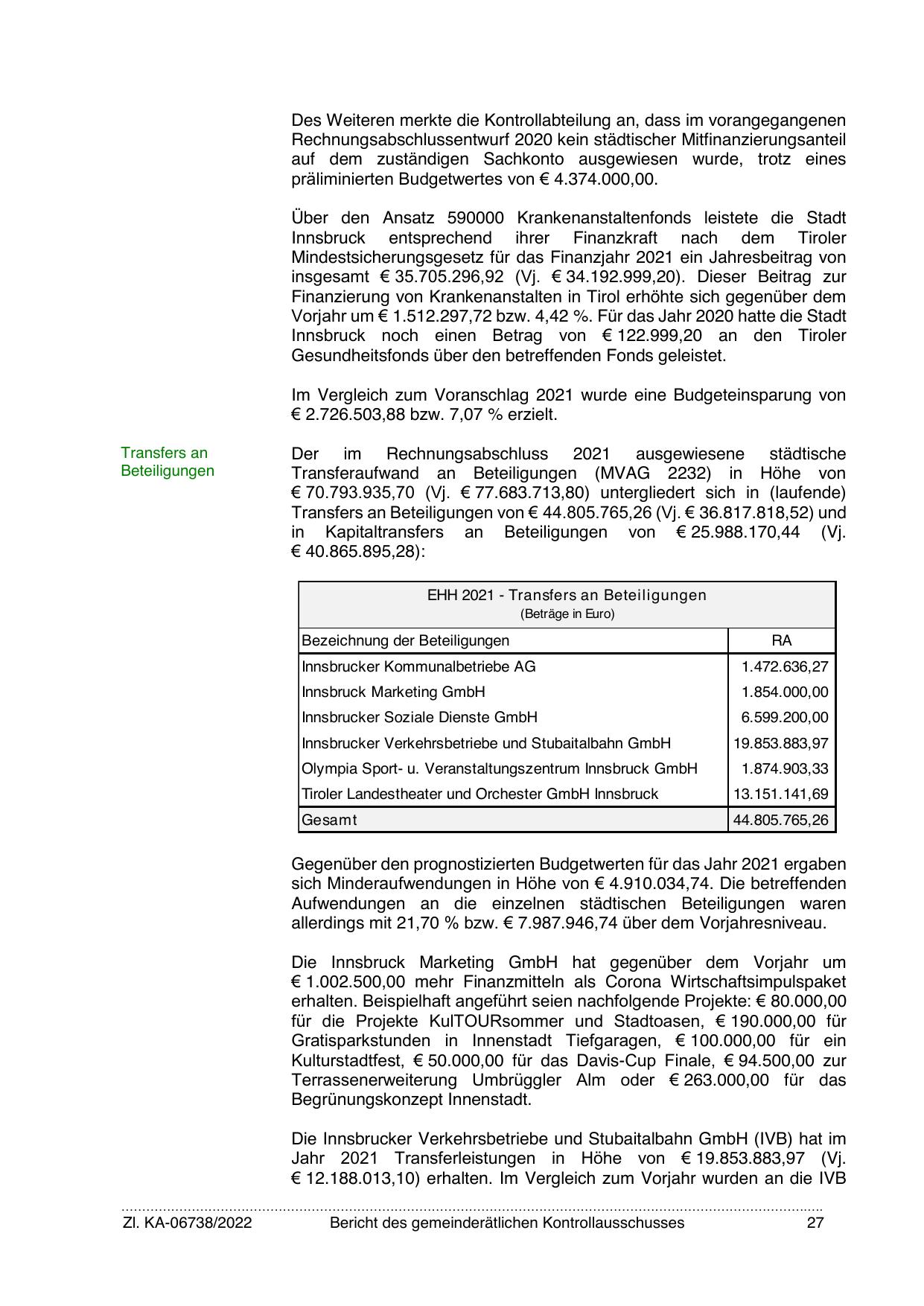 Jahr 2021 Transferleistungen in Höhe von € 19.853.883,97 (Vj.