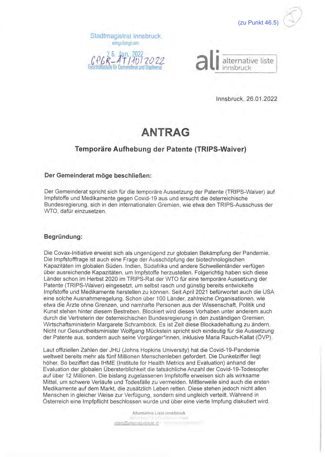 Der Gemeinderat spricht sich für die temporäre Aussetzung der Patente (TRIPS-Waiver) auf
