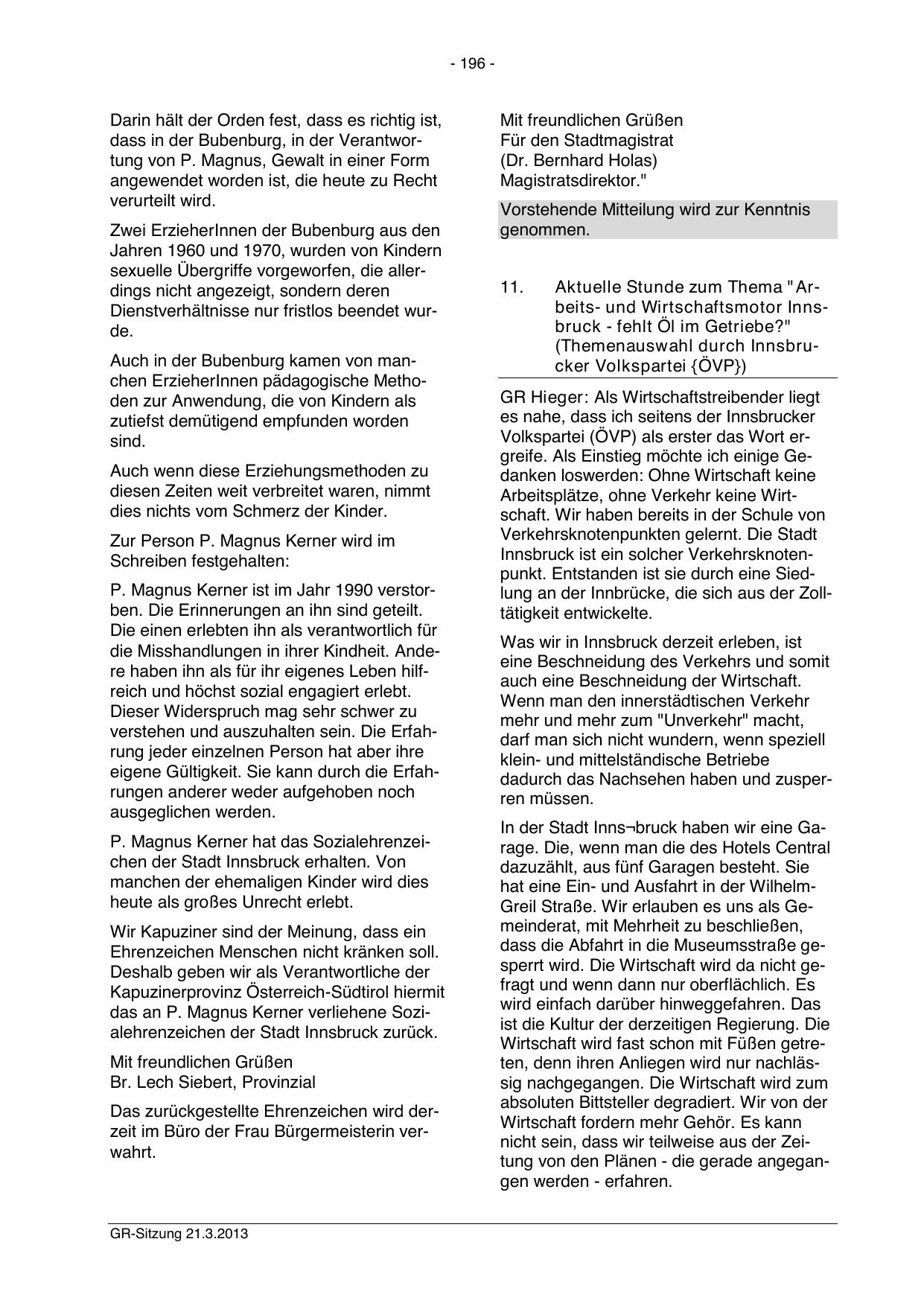 das an P. Magnus Kerner verliehene Sozialehrenzeichen der Stadt Innsbruck zurück.