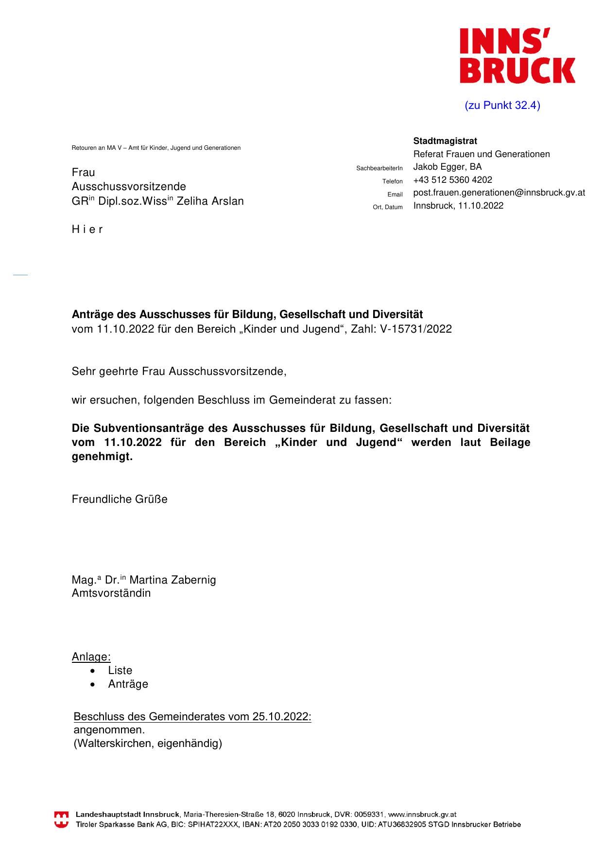vom 11.10.2022 für den Bereich „Kinder und Jugend“, Zahl: V-15731/2022