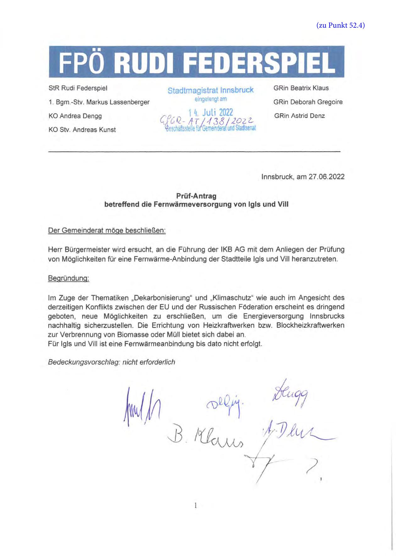 betreffend die Fernwärmeversorgung von Igls und Vill