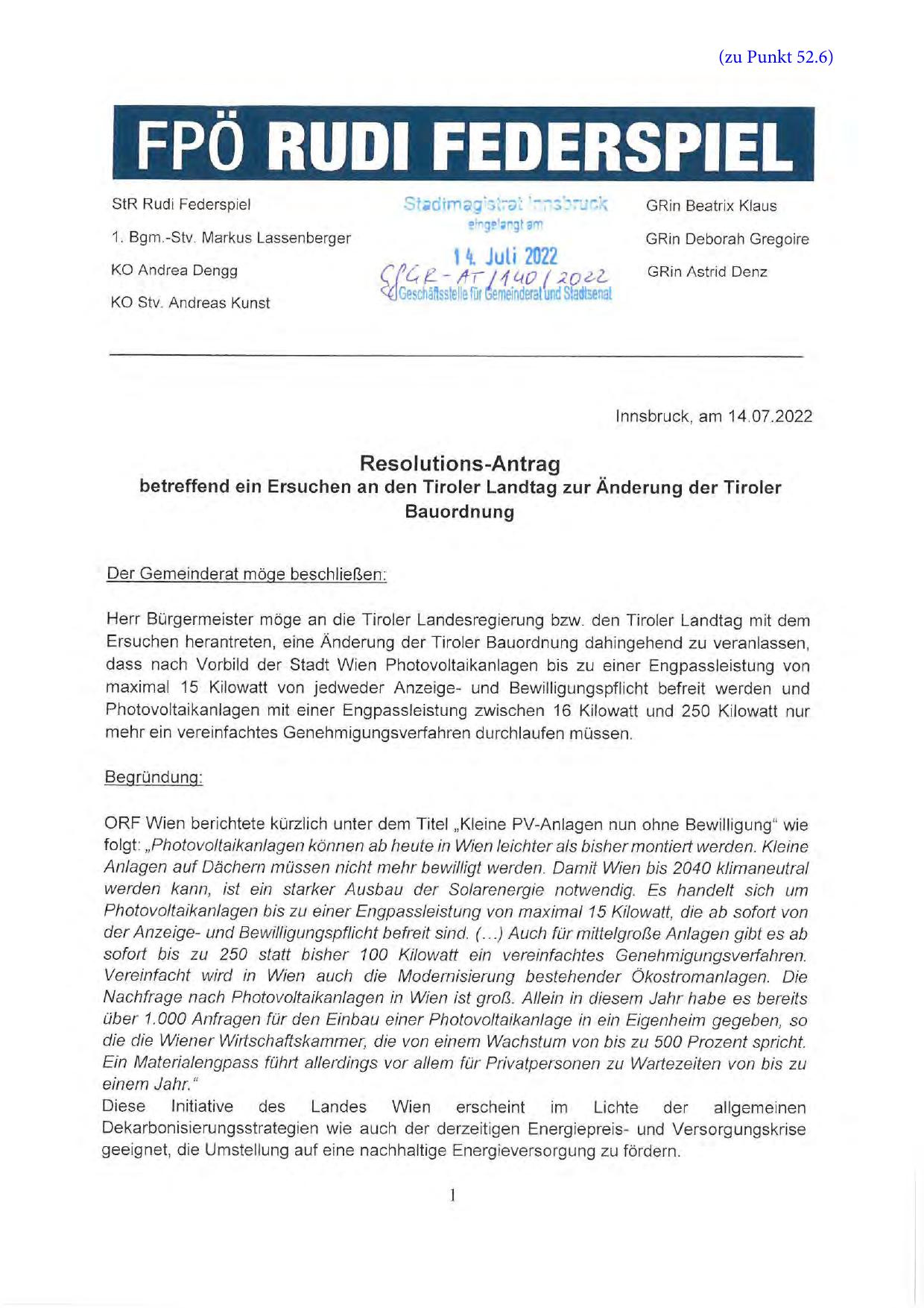 Herr Bürgermeister möge an die Tiroler Landesregierung bzw. den Tiroler Landtag mit dem