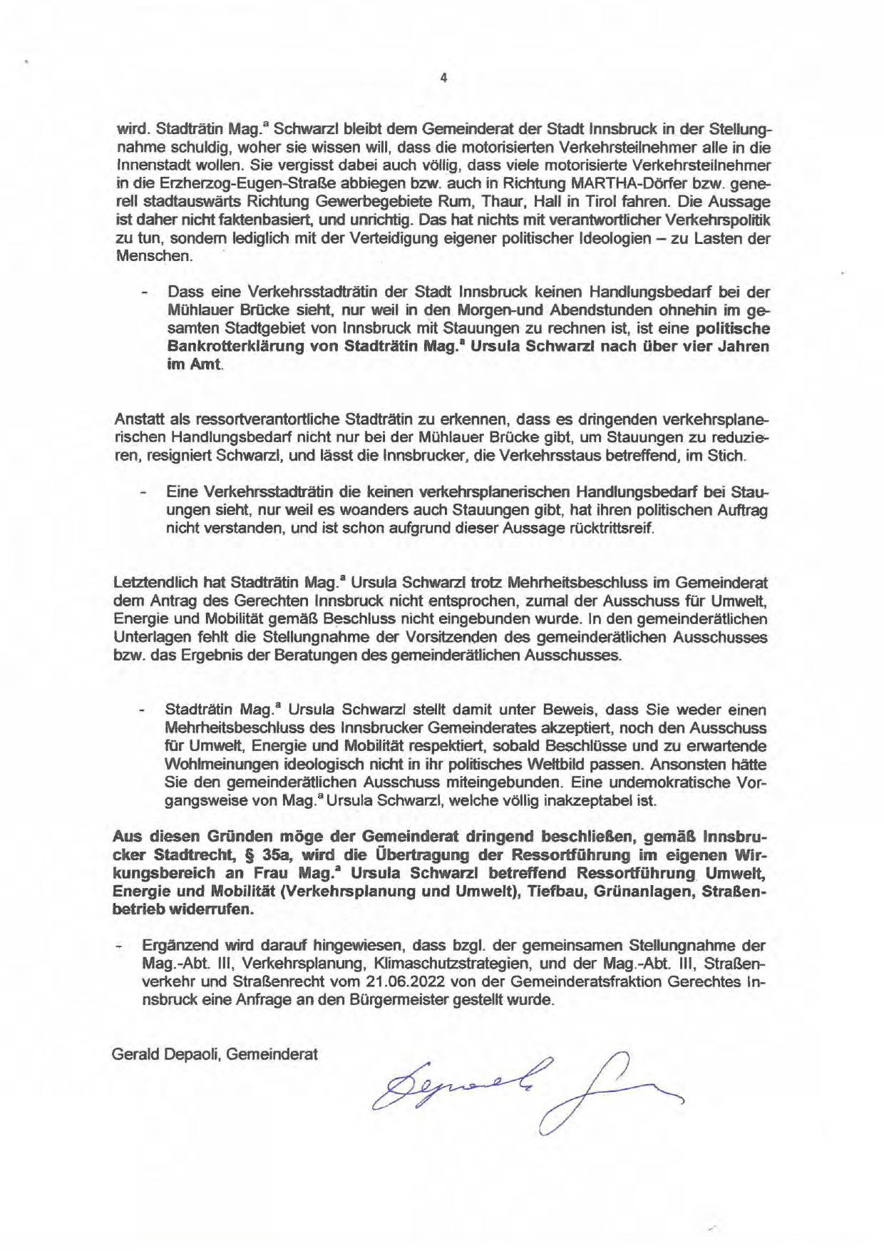 Aus diesen Gründen möge der Gemeinderat dringend beschließen, gemäß lnnsbrucker Stadtrecht, § 35a, wird die Übertragung der Ressortführung im eigenen Wirkungsbereich an Frau Mag.• Ursula Schwarzl betreffend Ressortführung Umwelt,