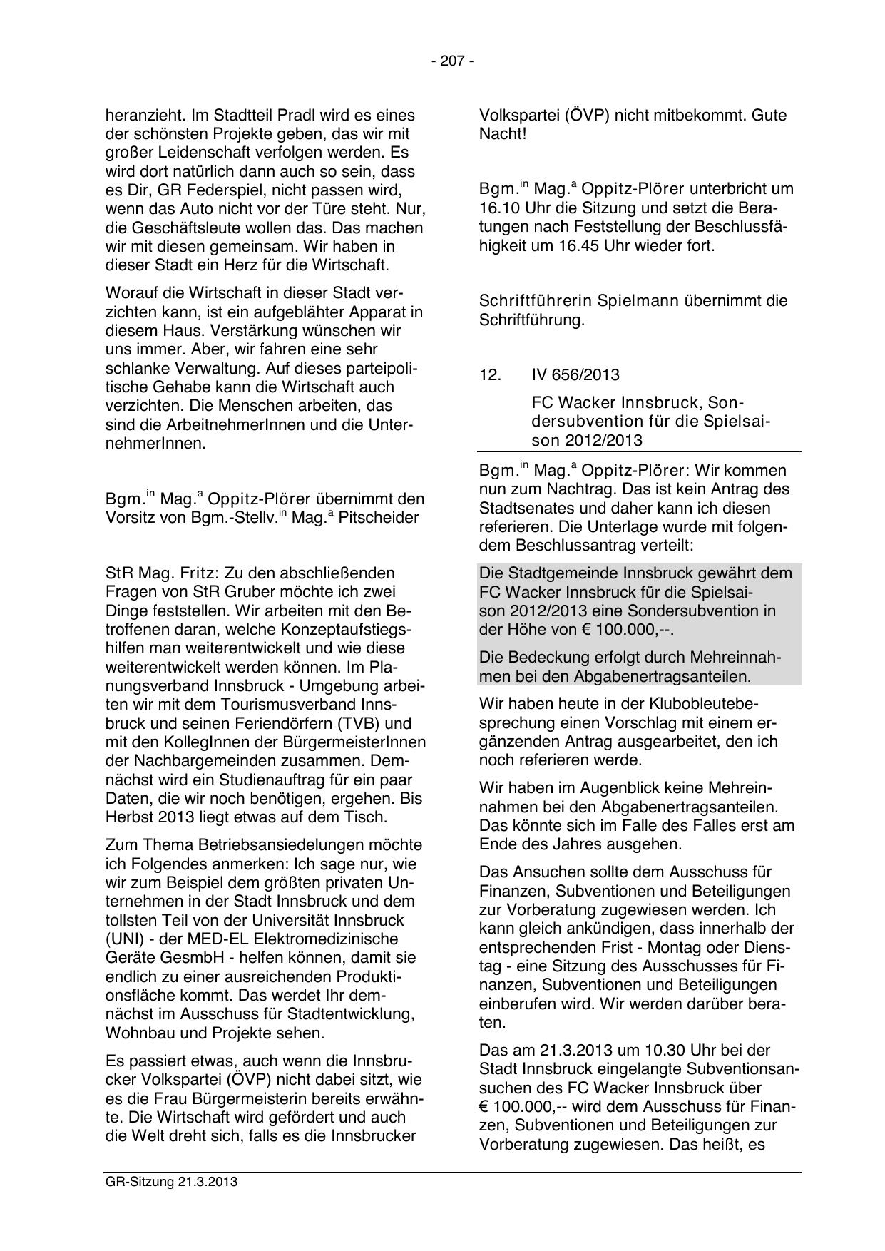FC Wacker Innsbruck für die Spielsaison 2012/2013 eine Sondersubvention in