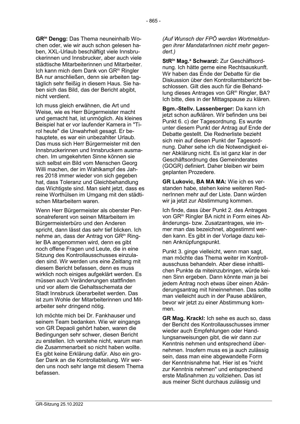 GRin Dengg: Das Thema neuneinhalb Wochen oder, wie wir auch schon gelesen haben, XXL-Urlaub beschäftigt viele Innsbruckerinnen und Innsbrucker, aber auch viele