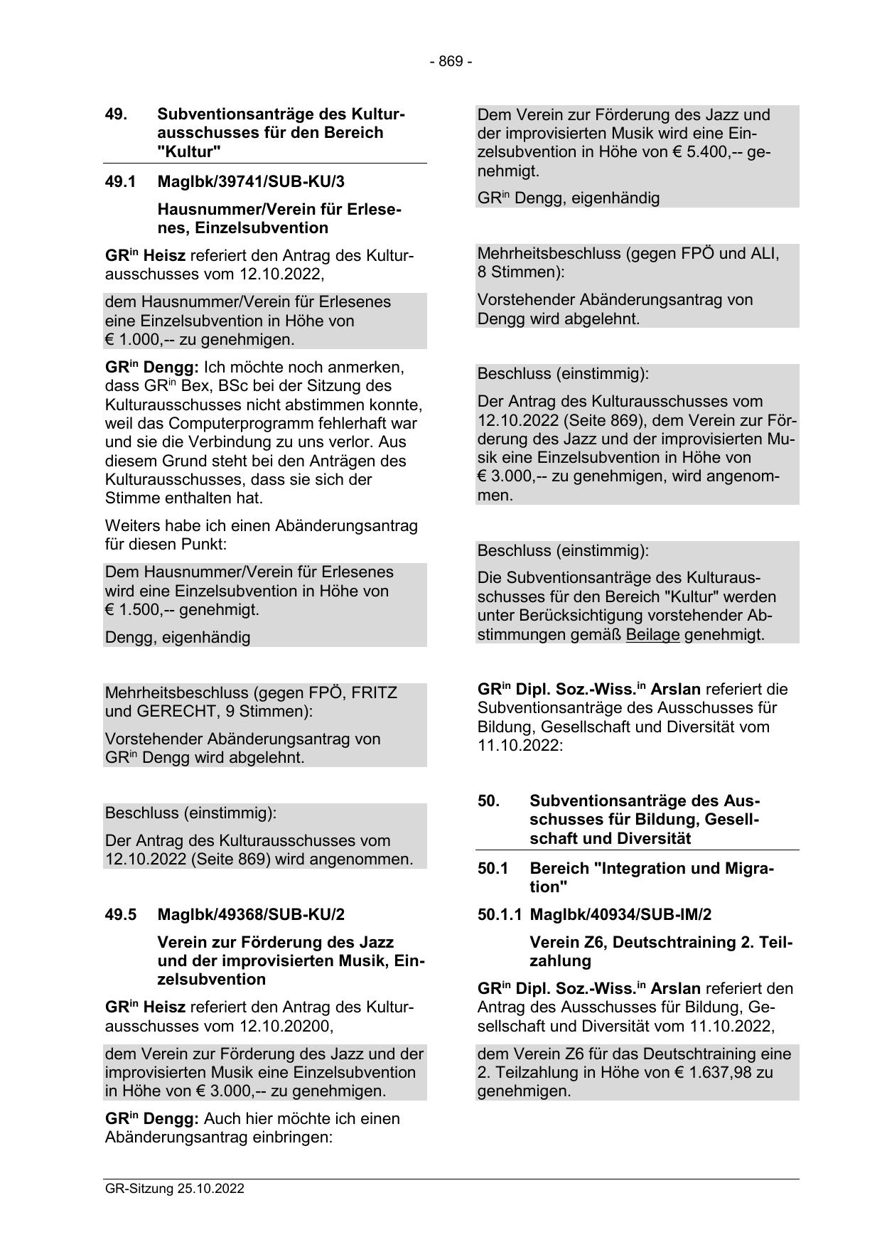 12.10.2022 (Seite 869), dem Verein zur Förderung des Jazz und der improvisierten Musik eine Einzelsubvention in Höhe von