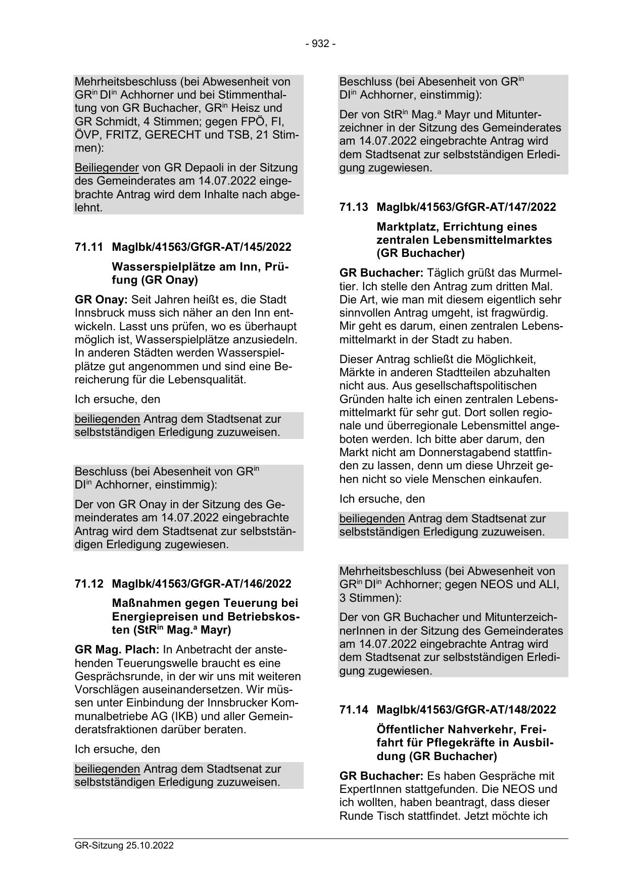 des Gemeinderates am 14.07.2022 eingebrachte Antrag wird dem Inhalte nach abgelehnt.