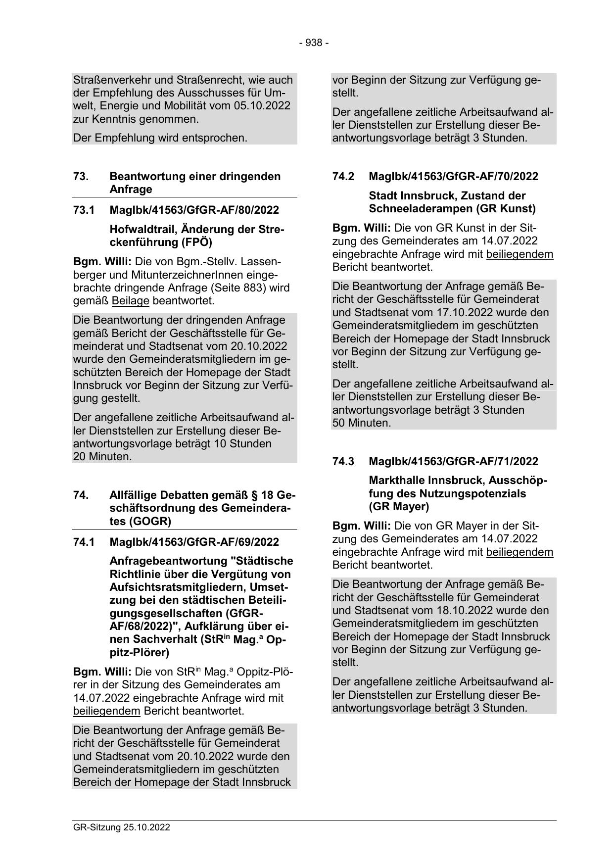 Bgm. Willi: Die von GR Mayer in der Sitzung des Gemeinderates am 14.07.2022