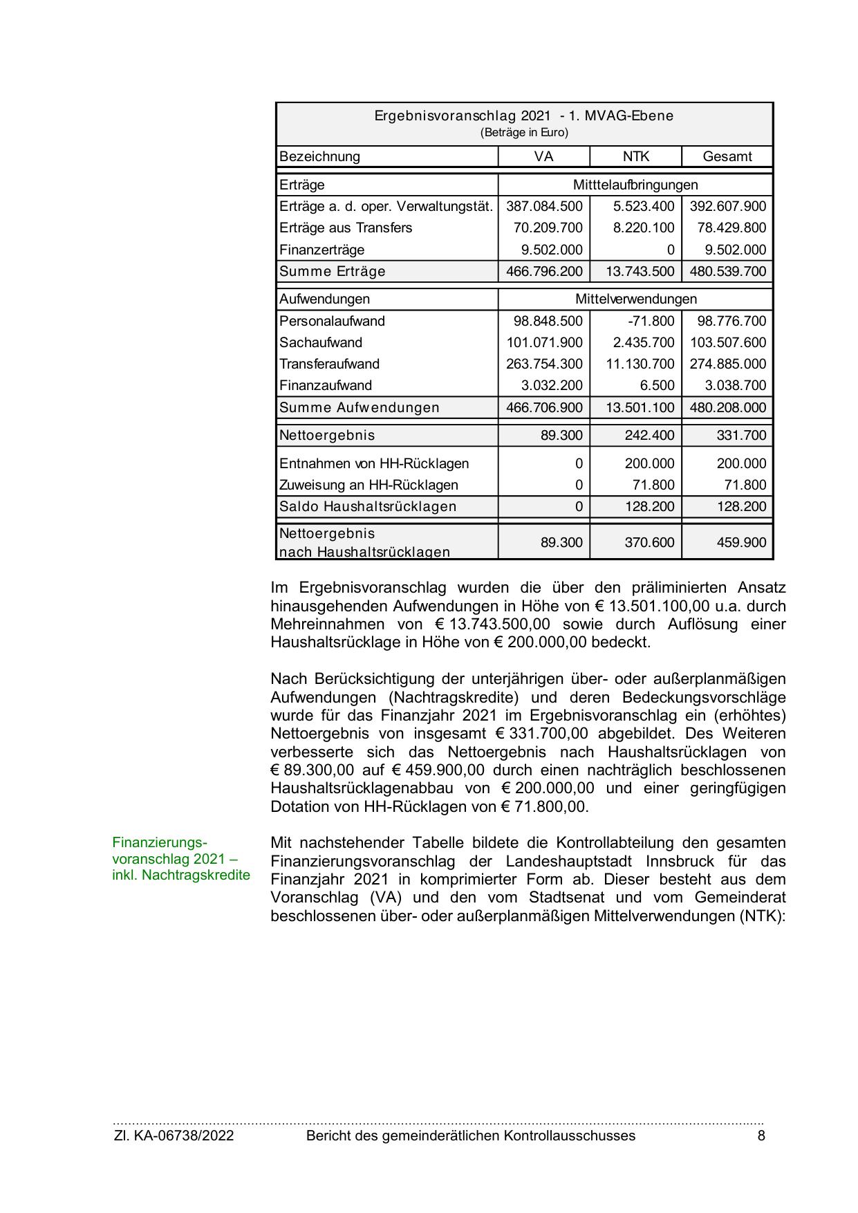 Voranschlag (VA) und den vom Stadtsenat und vom Gemeinderat