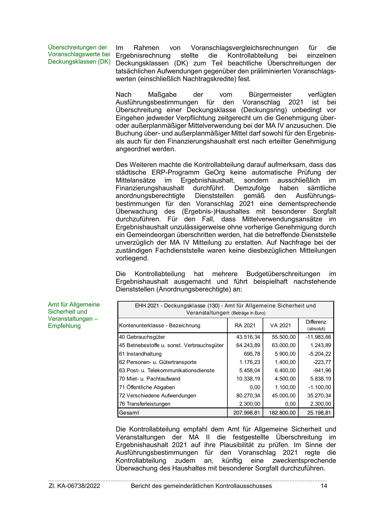 Veranstaltungen der MA II die festgestellte Überschreitung im
