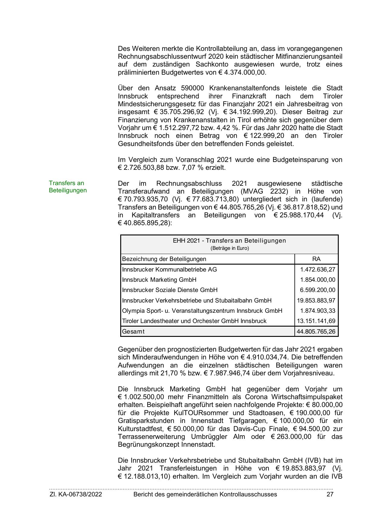Transfers an Beteiligungen von € 44.805.765,26 (Vj. € 36.817.818,52) und