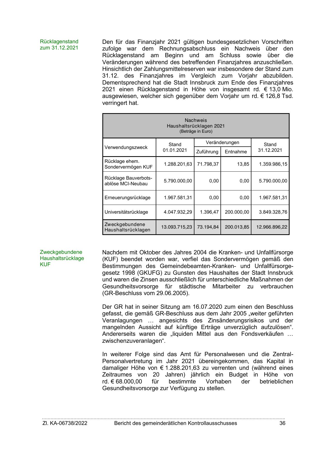 2021 einen Rücklagenstand in Höhe von insgesamt rd. € 13,0 Mio.