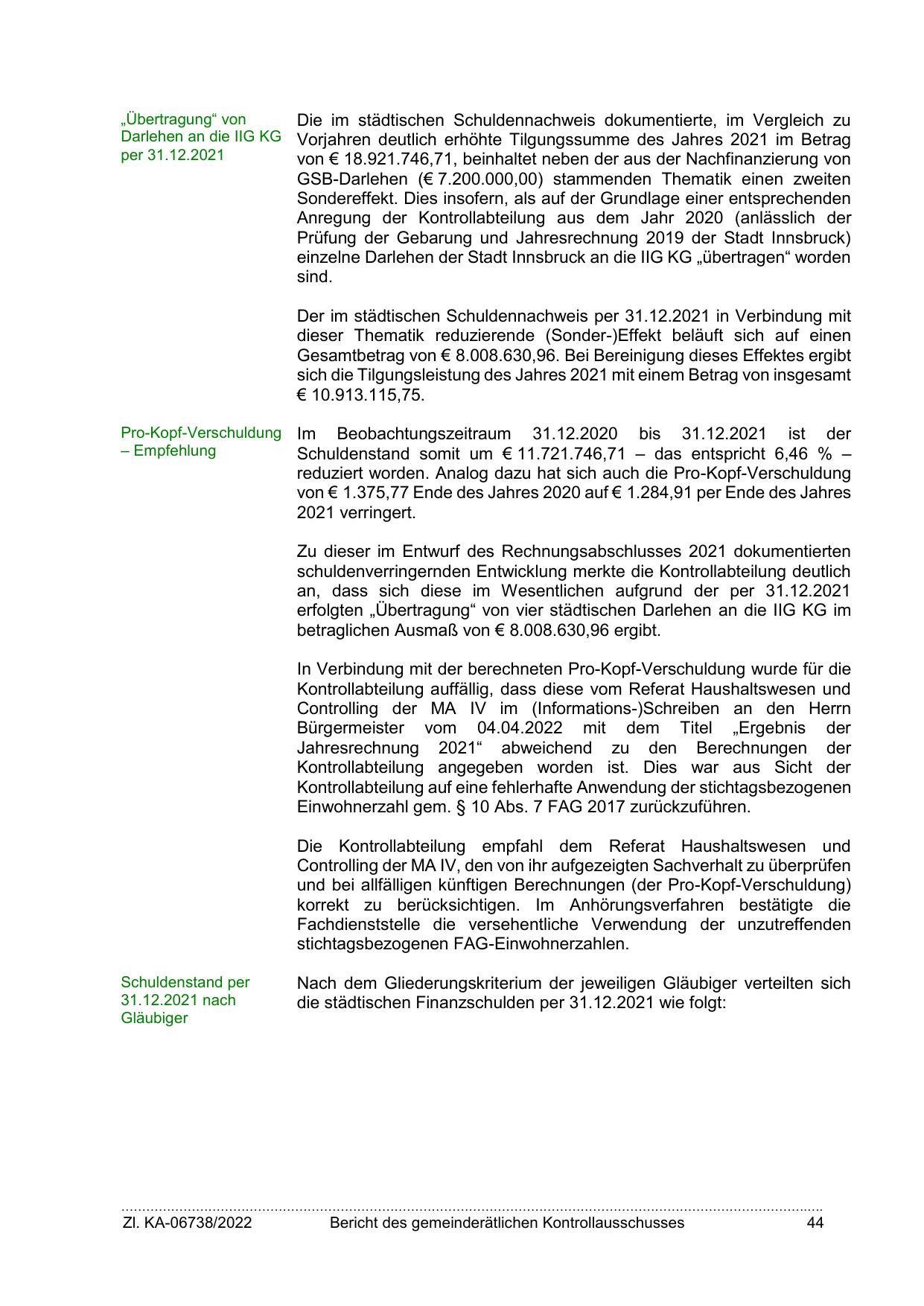 Der im städtischen Schuldennachweis per 31.12.2021 in Verbindung mit