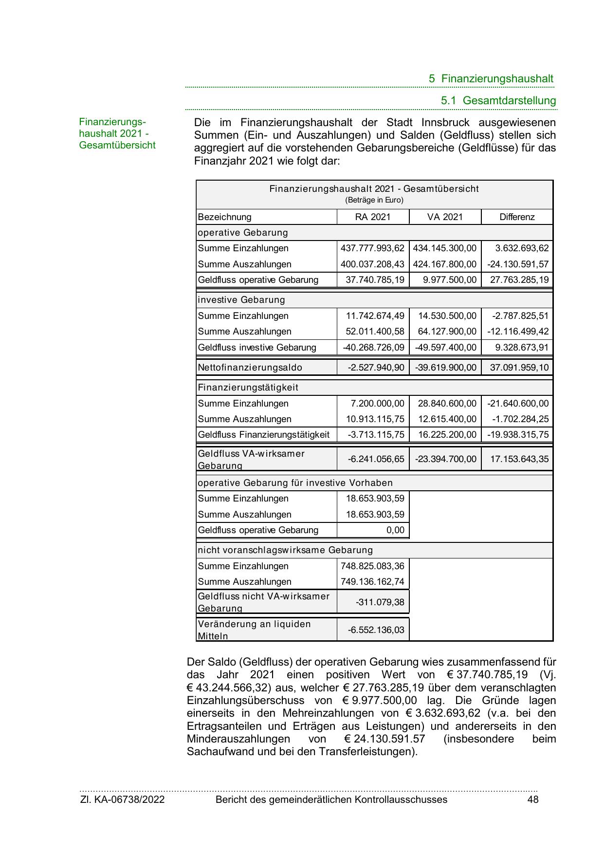 Die im Finanzierungshaushalt der Stadt Innsbruck ausgewiesenen