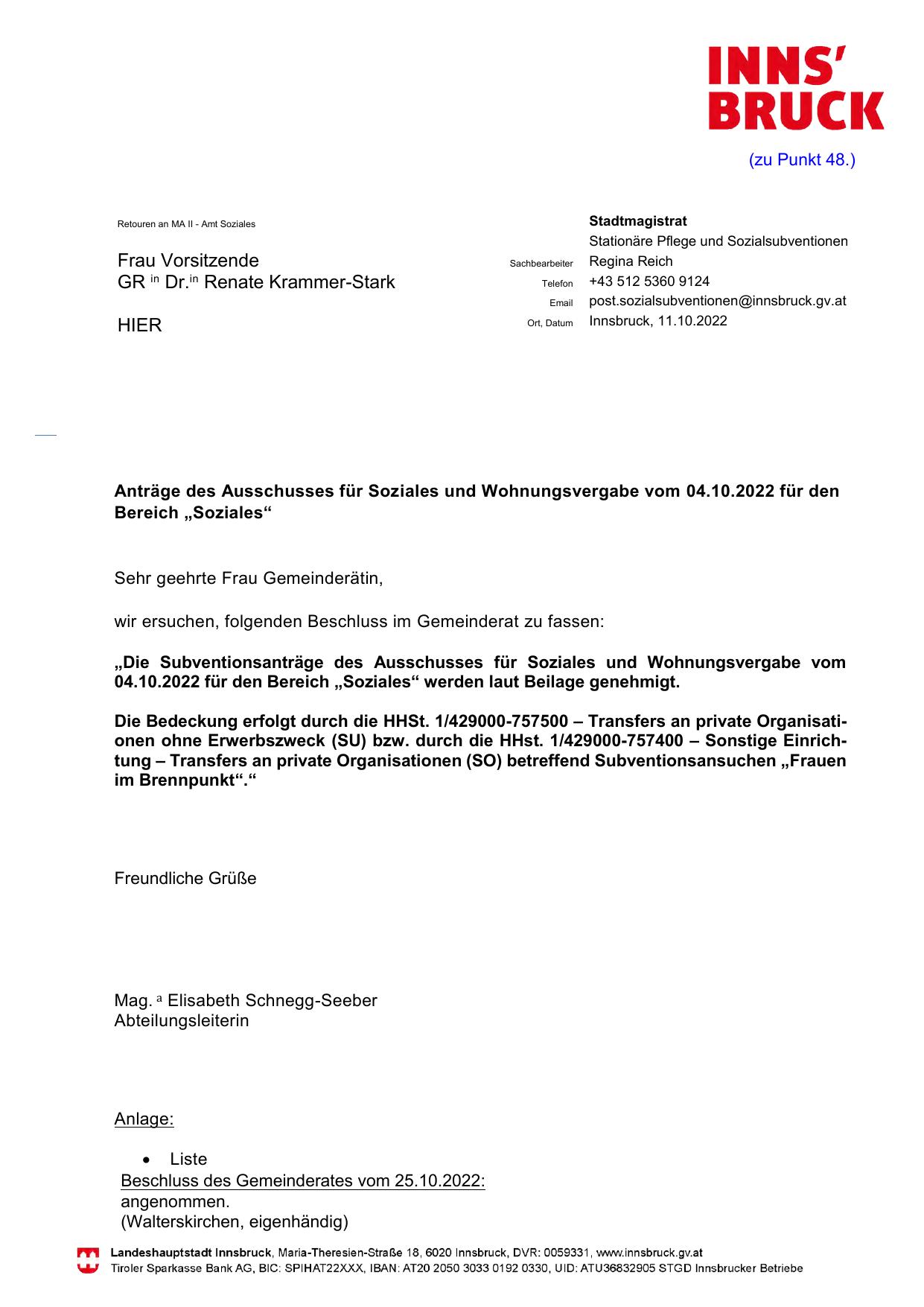 04.10.2022 für den Bereich „Soziales“ werden laut Beilage genehmigt.