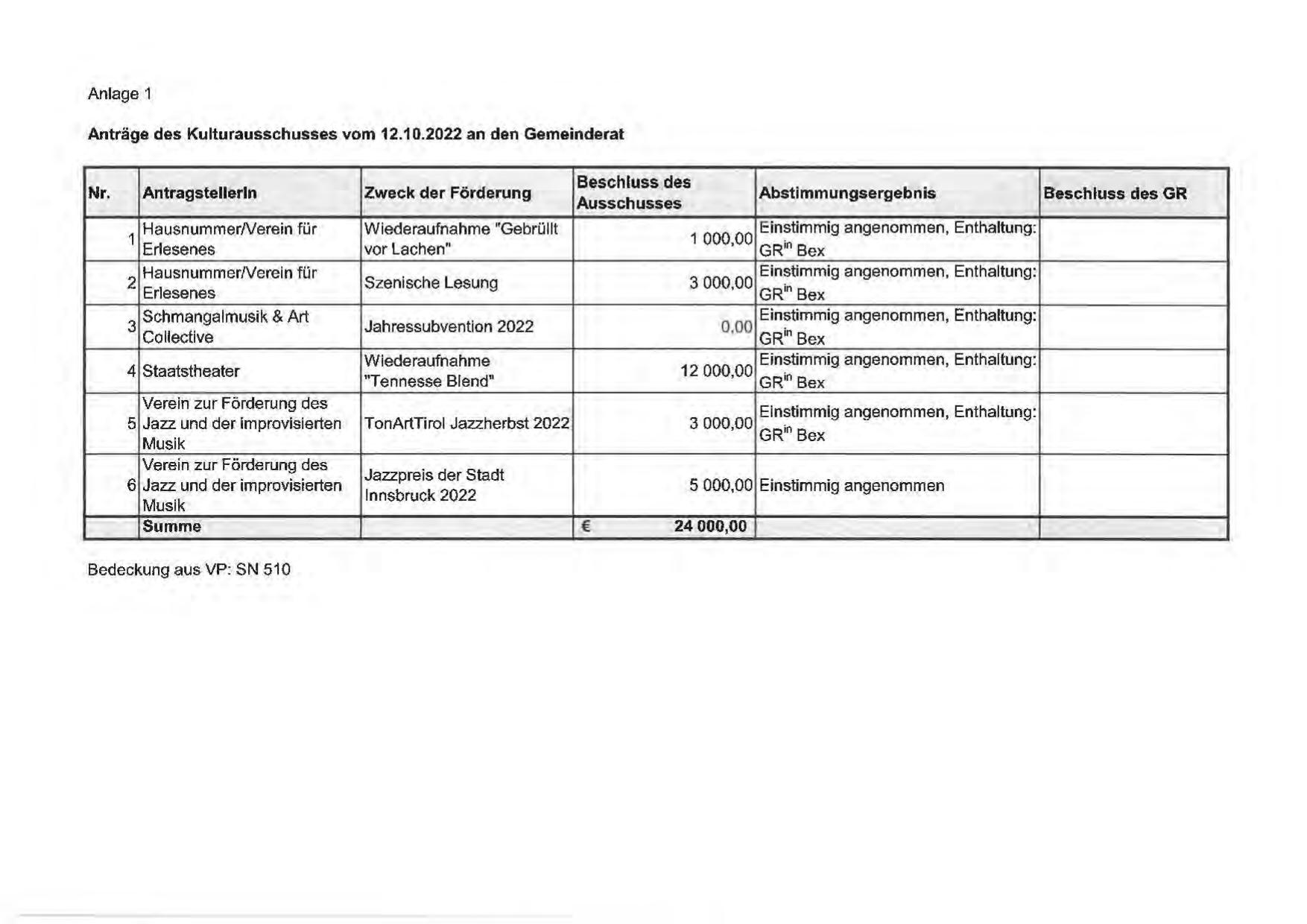 Anträge des Kulturausschusses vom 12.10.2022 an den Gemeinderat