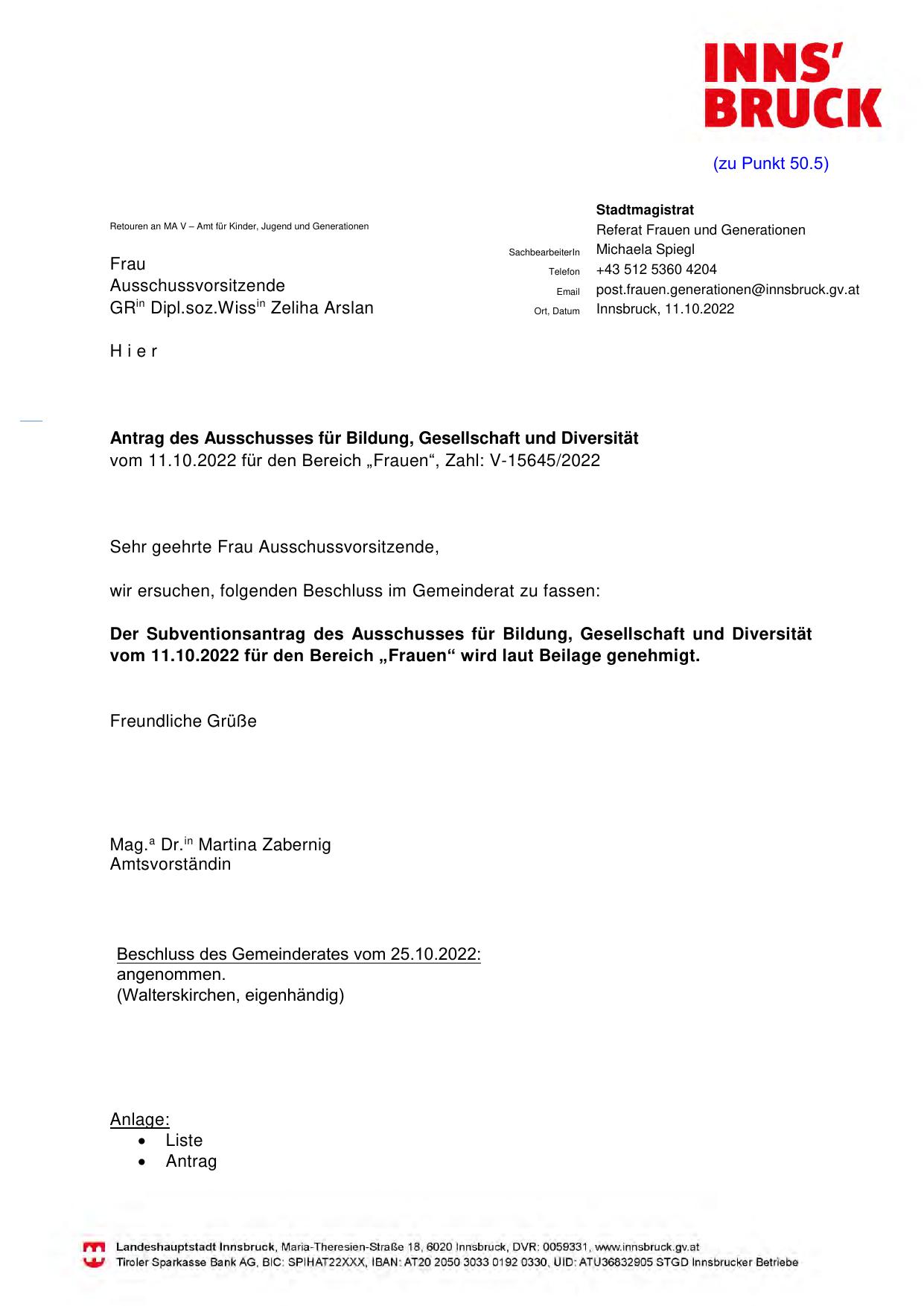 vom 11.10.2022 für den Bereich „Frauen“ wird laut Beilage genehmigt.