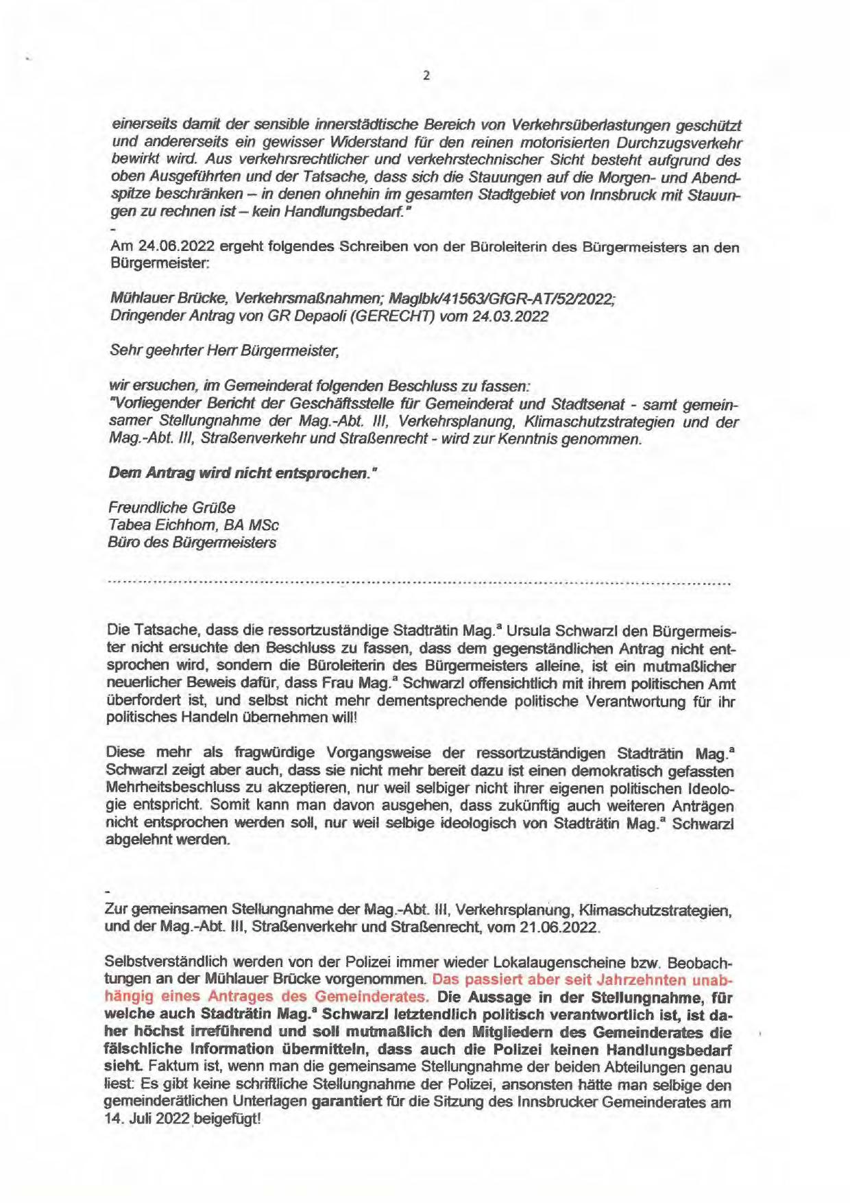 Selbstverständlich werden von der Polizei immer wieder Lokalaugenscheine bzw. Beobachtungen an der Mühlauer Brücke vorgenommen. Das passiert aber seit Jahrzehnten unabhängig eines Antrages des Gemeinderates. Die Aussage in der Stellungnahme, für
