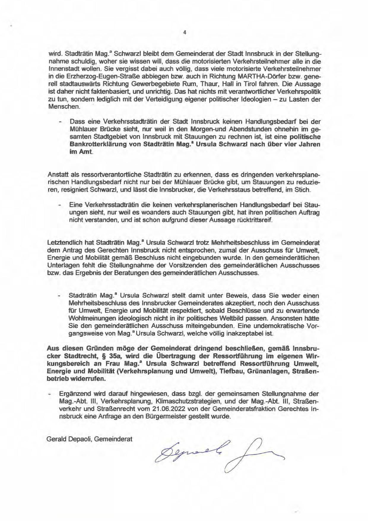 Aus diesen Gründen möge der Gemeinderat dringend beschließen, gemäß lnnsbrucker Stadtrecht, § 35a, wird die Übertragung der Ressortführung im eigenen Wirkungsbereich an Frau Mag.a Ursula Schwarz! betreffend Ressortführung Umwelt,