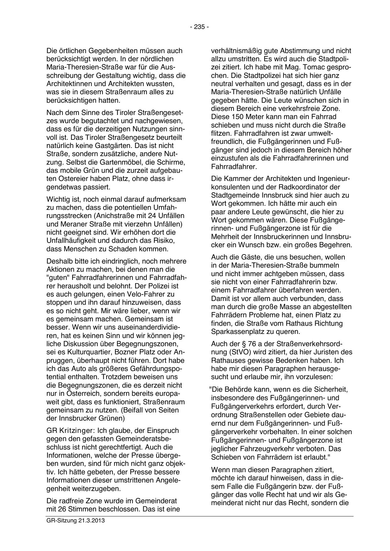möchte ich darauf hinweisen, dass in diesem Falle die Fußgängerin bzw. der Fußgänger das volle Recht hat und wir als Gemeinderat nicht nur das Recht, sondern die