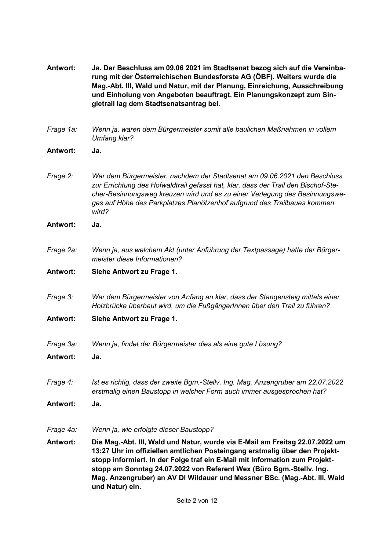Ja. Der Beschluss am 09.06 2021 im Stadtsenat bezog sich auf die Vereinbarung mit der Österreichischen Bundesforste AG (ÖBF). Weiters wurde die