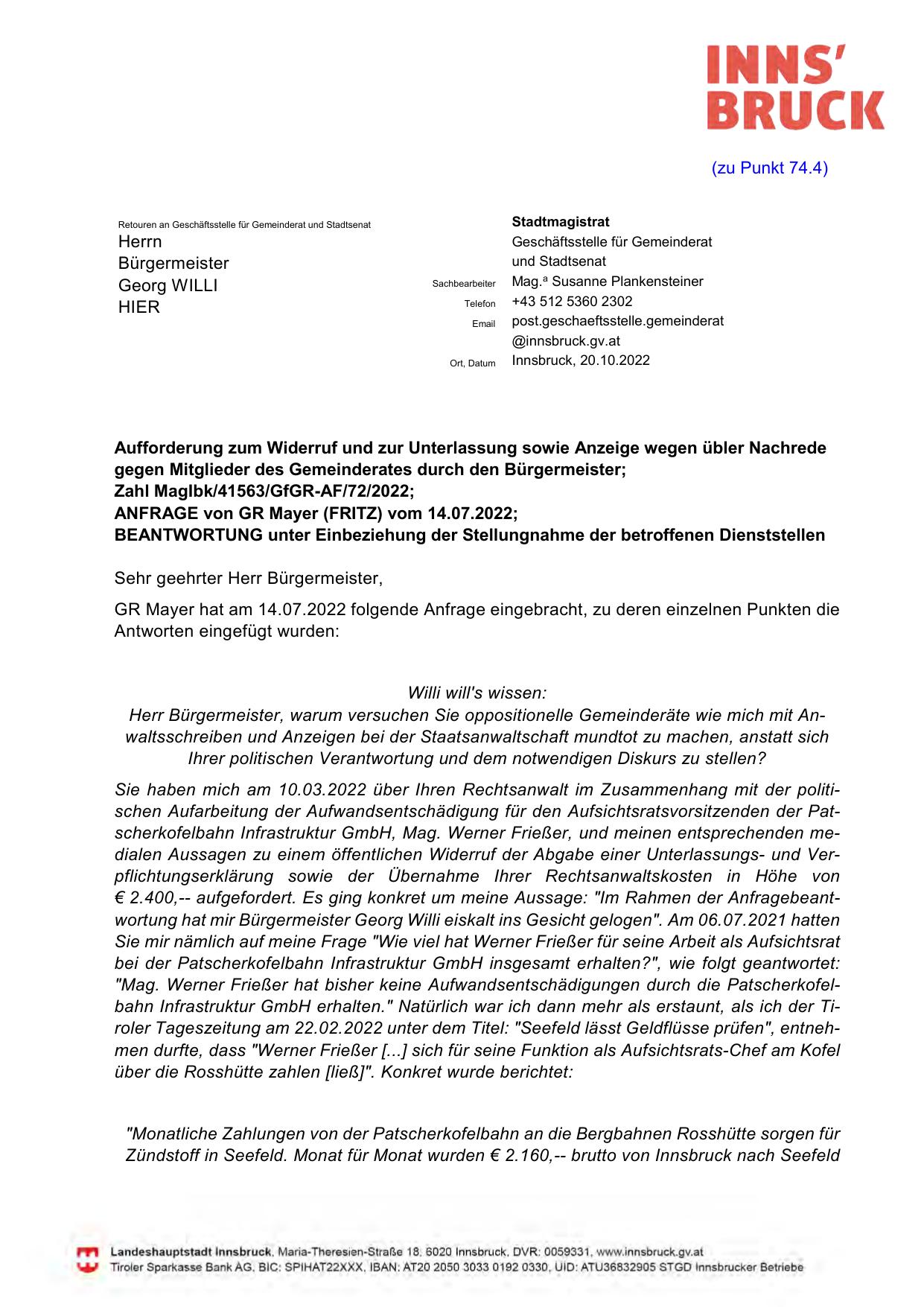 Sie haben mich am 10.03.2022 über Ihren Rechtsanwalt im Zusammenhang mit der politischen Aufarbeitung der Aufwandsentschädigung für den Aufsichtsratsvorsitzenden der Patscherkofelbahn Infrastruktur GmbH, Mag. Werner Frießer, und meinen entsprechenden medialen Aussagen zu einem öffentlichen Widerruf der Abgabe einer Unterlassungs- und Verpflichtungserklärung sowie der Übernahme Ihrer Rechtsanwaltskosten in Höhe von