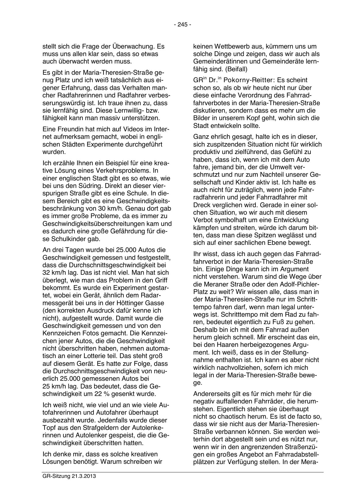 Es gibt in der Maria-Theresien-Straße genug Platz und ich weiß tatsächlich aus eigener Erfahrung, dass das Verhalten mancher Radfahrerinnen und Radfahrer verbesserungswürdig ist. Ich traue ihnen zu, dass