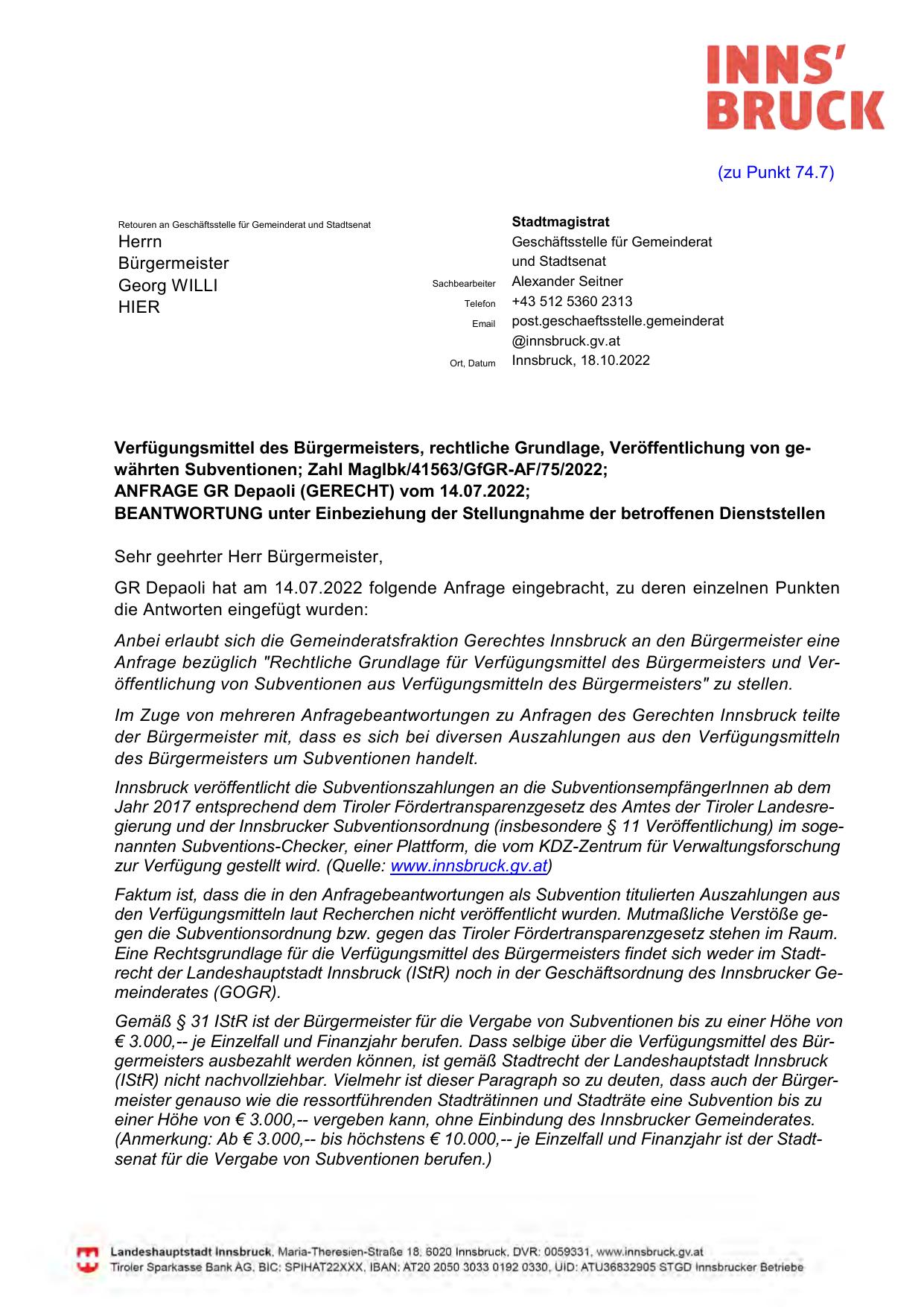 Anbei erlaubt sich die Gemeinderatsfraktion Gerechtes Innsbruck an den Bürgermeister eine