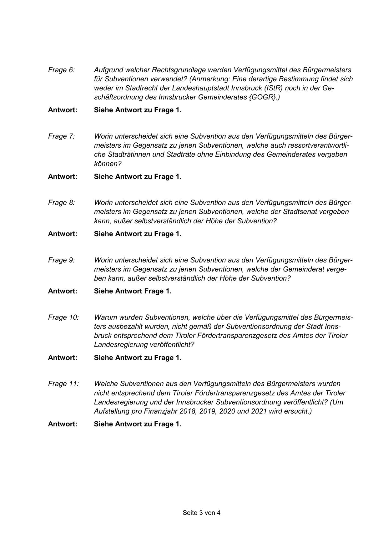 Warum wurden Subventionen, welche über die Verfügungsmittel des Bürgermeisters ausbezahlt wurden, nicht gemäß der Subventionsordnung der Stadt Innsbruck entsprechend dem Tiroler Fördertransparenzgesetz des Amtes der Tiroler