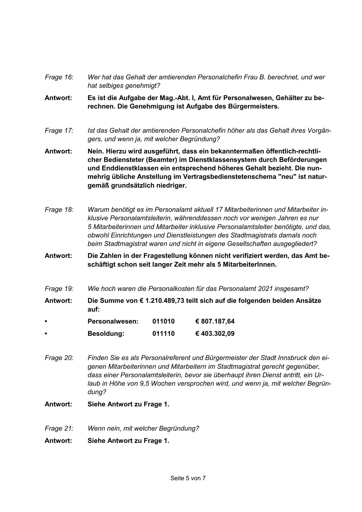 Finden Sie es als Personalreferent und Bürgermeister der Stadt Innsbruck den eigenen Mitarbeiterinnen und Mitarbeitern im Stadtmagistrat gerecht gegenüber,