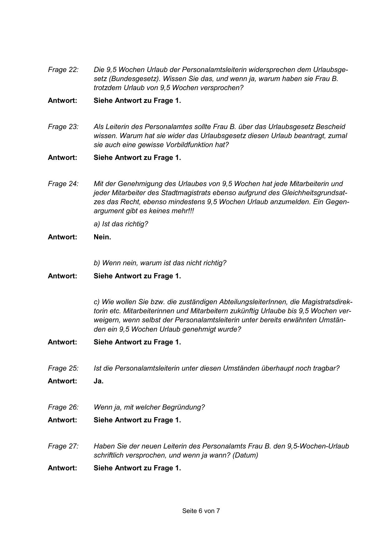 Die 9,5 Wochen Urlaub der Personalamtsleiterin widersprechen dem Urlaubsgesetz (Bundesgesetz). Wissen Sie das, und wenn ja, warum haben sie Frau B.