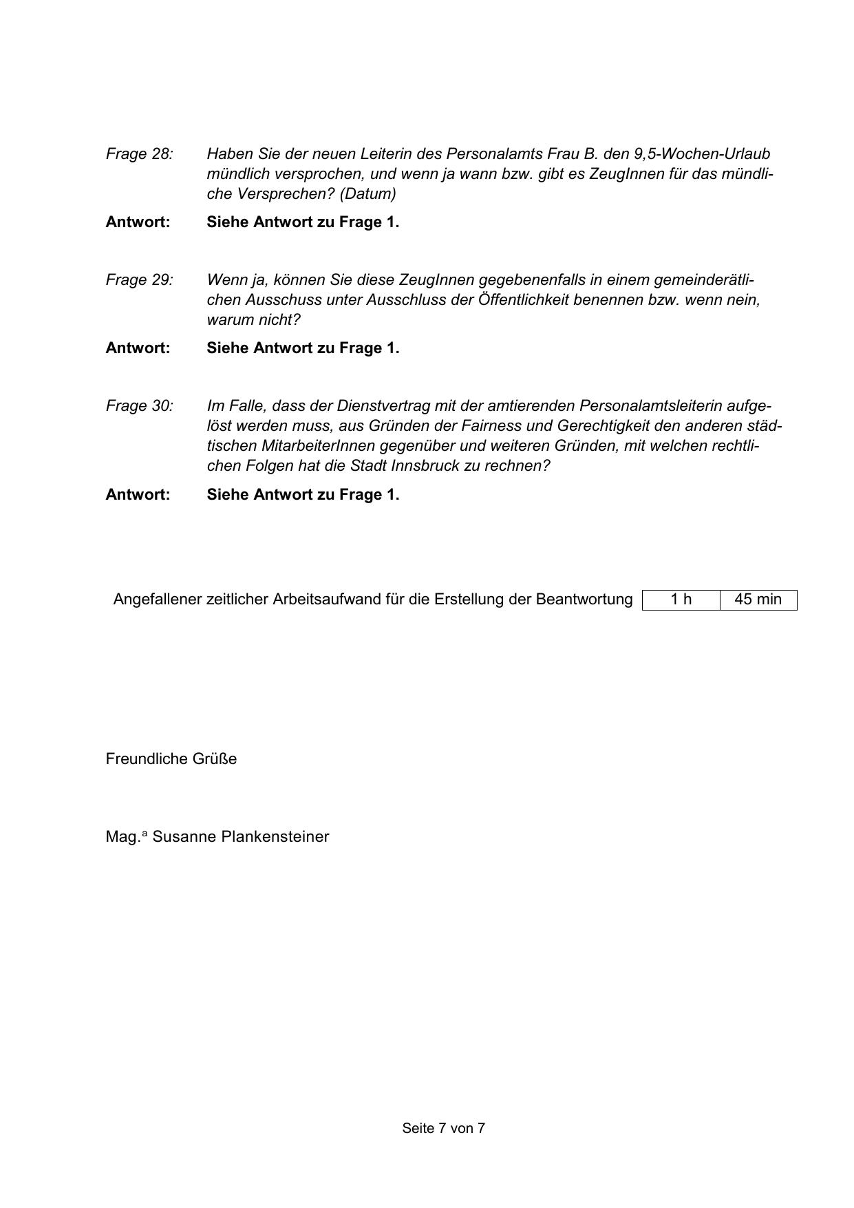 Im Falle, dass der Dienstvertrag mit der amtierenden Personalamtsleiterin aufgelöst werden muss, aus Gründen der Fairness und Gerechtigkeit den anderen städtischen MitarbeiterInnen gegenüber und weiteren Gründen, mit welchen rechtlichen Folgen hat die Stadt Innsbruck zu rechnen?
