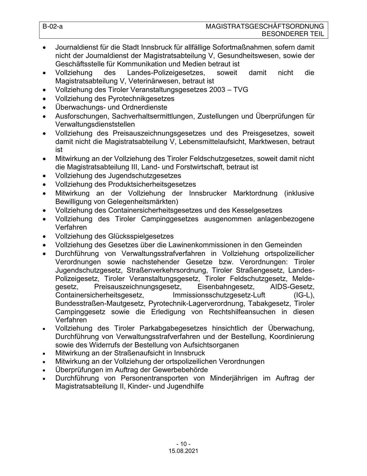 Jugendschutzgesetz, Straßenverkehrsordnung, Tiroler Straßengesetz, LandesPolizeigesetz, Tiroler Veranstaltungsgesetz, Tiroler Feldschutzgesetz, Meldegesetz,