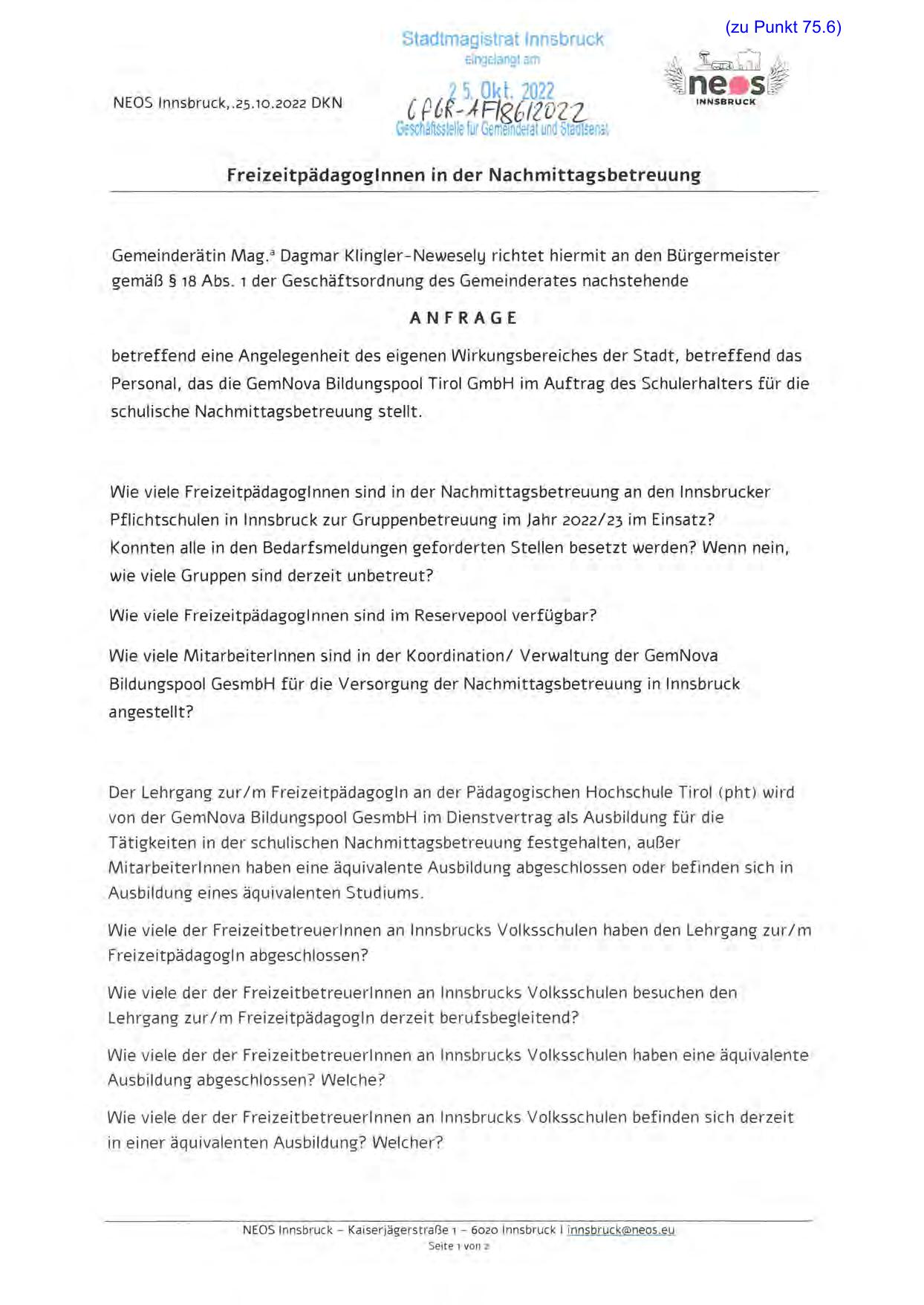 Wie viele Freizeitpädagoginnen sind in der Nachmittagsbetreuung an den lnnsbrucker