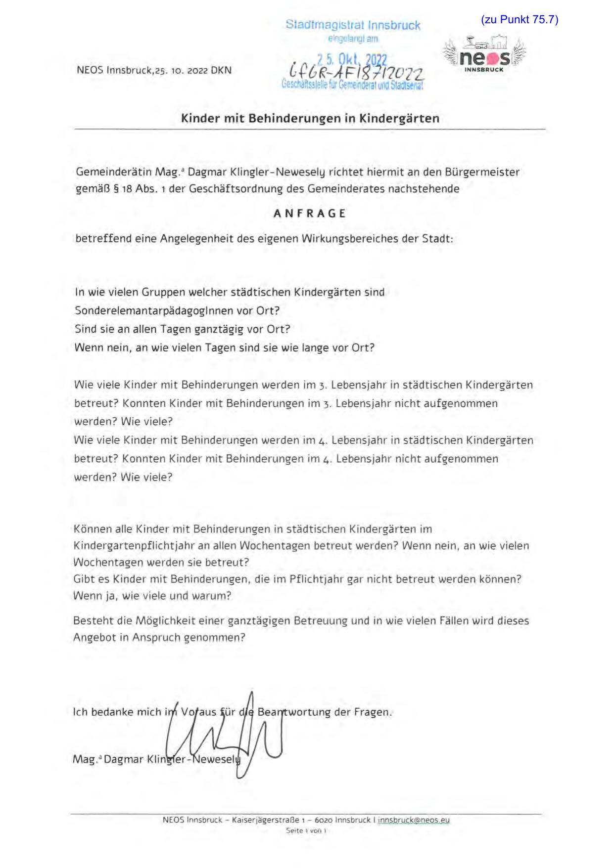 Gemeinderätin Mag.a Dagma r Klingler- Newesely richtet hiermit an den Bürgermeister